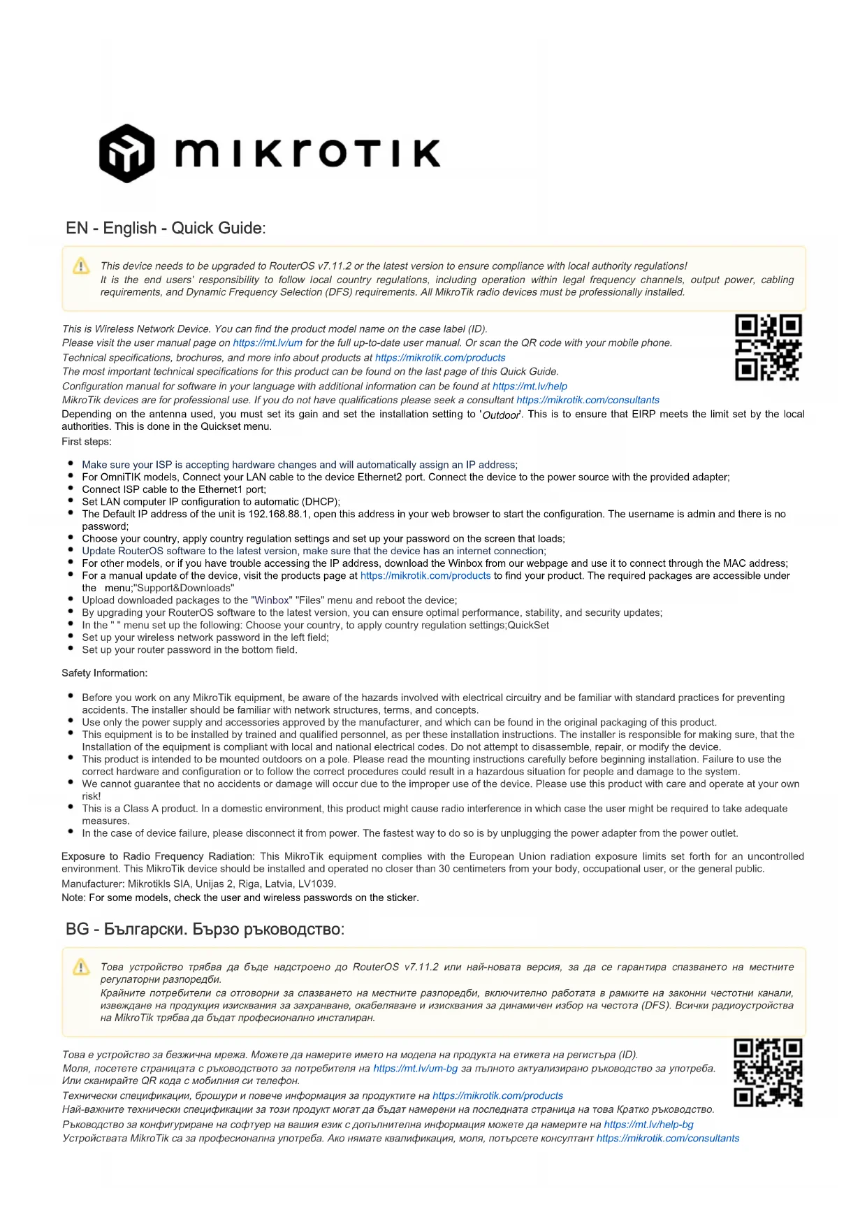 Il s'agit d'un périphérique réseau sans fil. Vous pouvez trouver le nom du modèle du produit sur l'étiquette du boîtier (ID). Veuillez visiter la page du manuel d'utilisation sur pour le manuel d'utilisation complet et à jour.https://mt.lv/um-fr Ou scannez le code QR avec votre téléphone portable. Spécifications techniques, brochures et plus d'informations sur les produits surhttps://mikrotik.com/products Les spécifications techniques les plus importantes de ce produit se trouvent sur la dernière page de ce guide rapide. Vous trouverez le manuel de configuration du logiciel dans votre langue avec des informations supplémentaires sur https://mt.lv/help-fr Les appareils MikroTik sont destinés à un usage professionnel. Si vous n'avez pas de qualifications, veuillez consulter un consultant https://mikrotik.com /consultants En fonction de l'antenne utilisée, vous devez régler son gain et régler le paramètre d'installation sur 'O '. utdoor Il s'agit de garantir que l'EIRP respecte la limite fixée par les autorités locales. Cela se fait dans le menuQuickset. Premiers pas: Assurez-vous que votre FAI accepte les modifications matérielles et attribuera automatiquement une adresse IP; Pour les modèles OmniTIK, connectez votre câble LAN au port Ethernet2 de l'appareil.Connectez l'appareil à la source d'alimentation avec l'adaptateur fourni; Connectez le câble ISP au port Ethernet1; Définissez la configuration IP de l'ordinateur LAN sur automatique (DHCP); L'adresse IP par défaut de l'unité est 192.168.88.1, ouvrez cette adresse dans votre navigateur Web pour démarrer la configuration.Le nom d'utilisateur est admin et il n'y a pas de mot de passe; Choisissez votre pays, pour appliquer les paramètres de réglementation du pays et configurez votre mot de passe sur l'écran qui se charge; Mettez à jour le logiciel RouterOS vers la dernière version, assurez-vous que l'appareil dispose d'une connexion Internet; Pour les autres modèles, ou si vous rencontrez des difficultés pour accéder à l'adresse IP, téléchargez la Winbox à partir de notre page Web et utilisez-la pour vous connecter via l'adresse MAC; Pour une mise à jour manuelle de l'appareil, visitez la page des produits sur pour trouver votre produit.Les packages requis sont https://mikrotik.com/products accessibles sous lemenu"Support&Downloads"; Téléchargez les packages téléchargés dans le menu " et redémarrez l'appareil;"Winbox "Files" En mettant à niveau votre logiciel RouterOS vers la dernière version, vous pouvez garantir des performances, une stabilité et des mises à jour de sécurité optimales; Dans le menu " configurez les éléments suivants: Choisissez votre pays, pour appliquer les paramètres de réglementation du pays;QuickSet" Configurez le mot de passe de votre réseau sans fil dans le champ de gauche; Configurez le mot de passe de votre routeur dans le champ du bas. Information sur la sécurité: Avant de travailler sur un équipement MikroTik, soyez conscient des dangers liés aux circuits électriques et familiarisez-vous avec les pratiques standard de prévention des accidents. Le programme d'installation doit être familiarisé avec les structures, les termes et les concepts du réseau. Utilisez uniquementl'alimentation et accessoires approuvés par le fabricant, etquipeuvent être a trouvé dansl'emballage d'origine de ce produit. Cet équipement doit être installé par du personnel formé et qualifié, conformément à ces instructions d'installation. L'installateur est responsable de s'assurer que l'installation de l'équipement est conforme aux codes électriques locaux et nationaux. N'essayez pas de démonter, réparer ou modifier l'appareil. Ce produit est destiné à être monté à l'extérieur sur un poteau. Veuillez lire attentivement les instructions de montage avant de commencer l'installation. Le fait de ne pas utiliser lematériel et la configuration corrects ou de ne pas suivre les procédures correctes peut entraîner une situation dangereuse pour les .personnes et endommager le système Nous ne pouvons garantir qu'aucun accident ou dommage ne se produira en raison d'une mauvaise utilisation de l'appareil. Veuillez utiliser ce produit avec soin et l'utiliser à vos propres risques! Ceci est un produit de classe A. Dans un environnement domestique, ce produit peut provoquer des interférences radio, auquel cas l'utilisateur peut être amené à prendre des mesures adéquates. En cas de panne de l'appareil, veuillez le déconnecter de l'alimentation. La façon la plus rapide de le faire est de débrancher l'adaptateur secteur de la prise de courant. cet équipement MikroTik est conforme aux limites d'exposition aux rayonnements Union européenne établies pourExposition aux rayonnements radiofréquences: un environnement non contrôlé. Cet appareil MikroTik doit être installé et utilisé à au moins30 centimètres de votre corps, de l'utilisateur professionnel ou du grand public. Fabricant: Mikrotikls SIA, Unijas 2, Riga, Lettonie, LV1039. Pour certains modèles, vérifiez les mots de passe utilisateur et sans fil sur l'autocollant.Noter: HR - Hrvatski. Brzi vodič: Cet appareil doit être mis à niveau vers RouterOS v7.11.2 ou la dernière version pour garantir la conformité aux réglementations des autorités locales. Il est de la responsabilité des utilisateurs finaux de suivre les réglementations locales du pays, y compris le fonctionnement dans les canaux de fréquence légaux, la sortie
