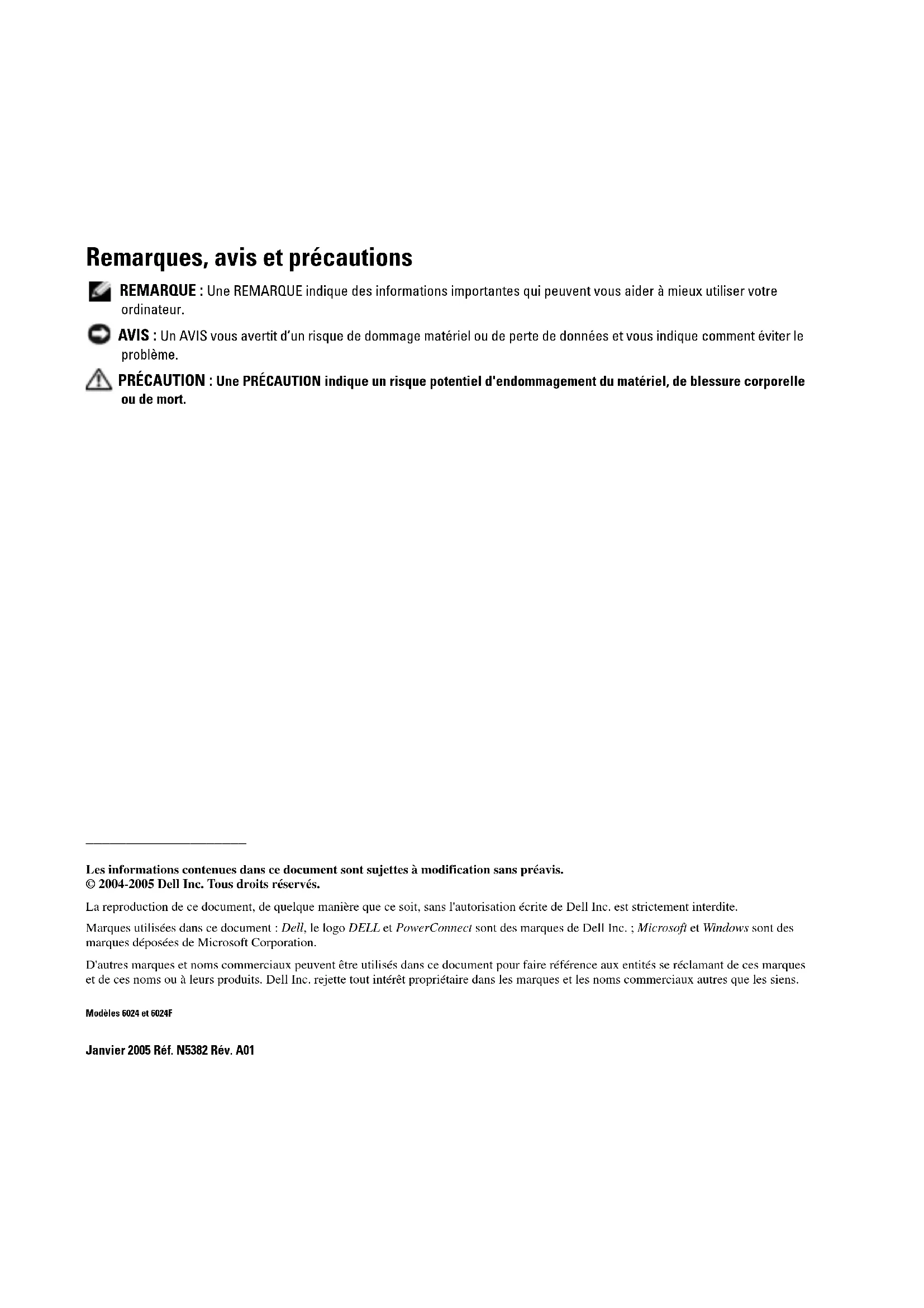 Les informations contenues dans ce document sont sujettes à modification sans préavis. © 2004-2005 Dell Inc. Tous droits réservés. La reproduction de ce document, de quelque manière que ce soit, sans l'autorisation écrite de Dell Inc. est strictement interdite. Marques utilisées dans ce document : Dell, le logo DELL et PowerConnect sont des marques de Dell Inc. ; Microsoft et Windows sont des marques déposées de Microsoft Corporation. D'autres marques et noms commerciaux peuvent être utilisés dans ce document pour faire référence aux entités se réclamant de ces marques et de ces noms ou à leurs produits. Dell Inc. rejette tout intérêt propriétaire dans les marques et les noms commerciaux autres que les siens. Modèles 6024 et 6024F Janvier 2005 Réf. N5382 Rév. A01Guide de mise en route 47 Installation Présentation générale Ce guide présente des informations de base concernant l'installation, la configuration et l'exécution des systèmes Dell™ PowerConnect™ 6024 et 6024F. Pour en savoir plus, reportez-vous au Guide d'utilisation , qui se trouve sur votre CD Documentation utilisateur ou consultez le site Web de support technique de Dell à l'adresse support.dell.com pour obtenir les dernières mises à jour de la documentation et des logiciels. Préparation du site Les appareils PowerConnect 60