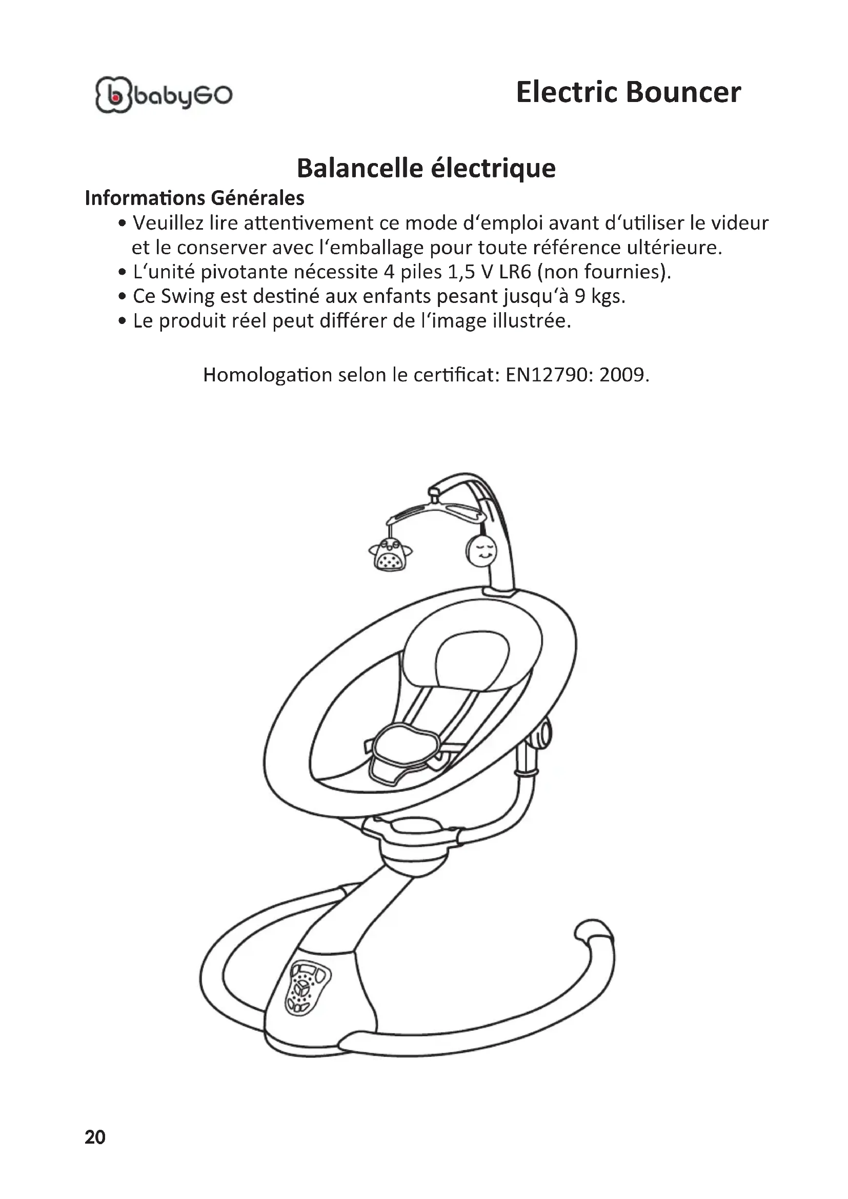 soienttenusàl‘écartlorsdudépliageetdupliagedeceproduit. 8.Soyezconscientdesrisquesd‘incendiecausésparlaproximitédesources dechaleurintense,tellesqueleschauagesélectriques,lesfeuxàgaz,etc. 9.Ceproduitn‘estpasdesnéàunepériodedesommeilprolongée.Sivotre bébéabesoindedormir,placez-ledansunlitouunberceauapproprié. 10.N‘ulisezpasleproduitsanslecoussindusiège. 11.Cesseztouteulisaonduproduits‘ilestendommagéoucassé. 12.Neplacezpaslabalancelleprèsdesfenêtresoudesmurs,oùlesls,les rideauxoulesautresobjetspeuventêtreulisésparlebébépoursorrdu siègedelabalancelleetévitertoutrisqued‘étouementoudesuocaon. 13.Neplacezpaslabalancelleprèsdesfenêtresoudesmurs,pouréviter quelebébén‘aectelastabilitédelabalancelle,lafaisantbasculersuiteà lapressiondesespiedscontrelemur. POUR UNE UTILISATION EN TOUTE SECURITE DES PILES 1.Conservezlespileshorsdeportéedesenfants. 2 Seules des piles recommandées ou équivalentes, de même voltage et formatdoiventêtreulisées. 3.Lespilessontinséréesaveclapolaritécorrecte. 4.Rerezlespilesusagersduproduit.