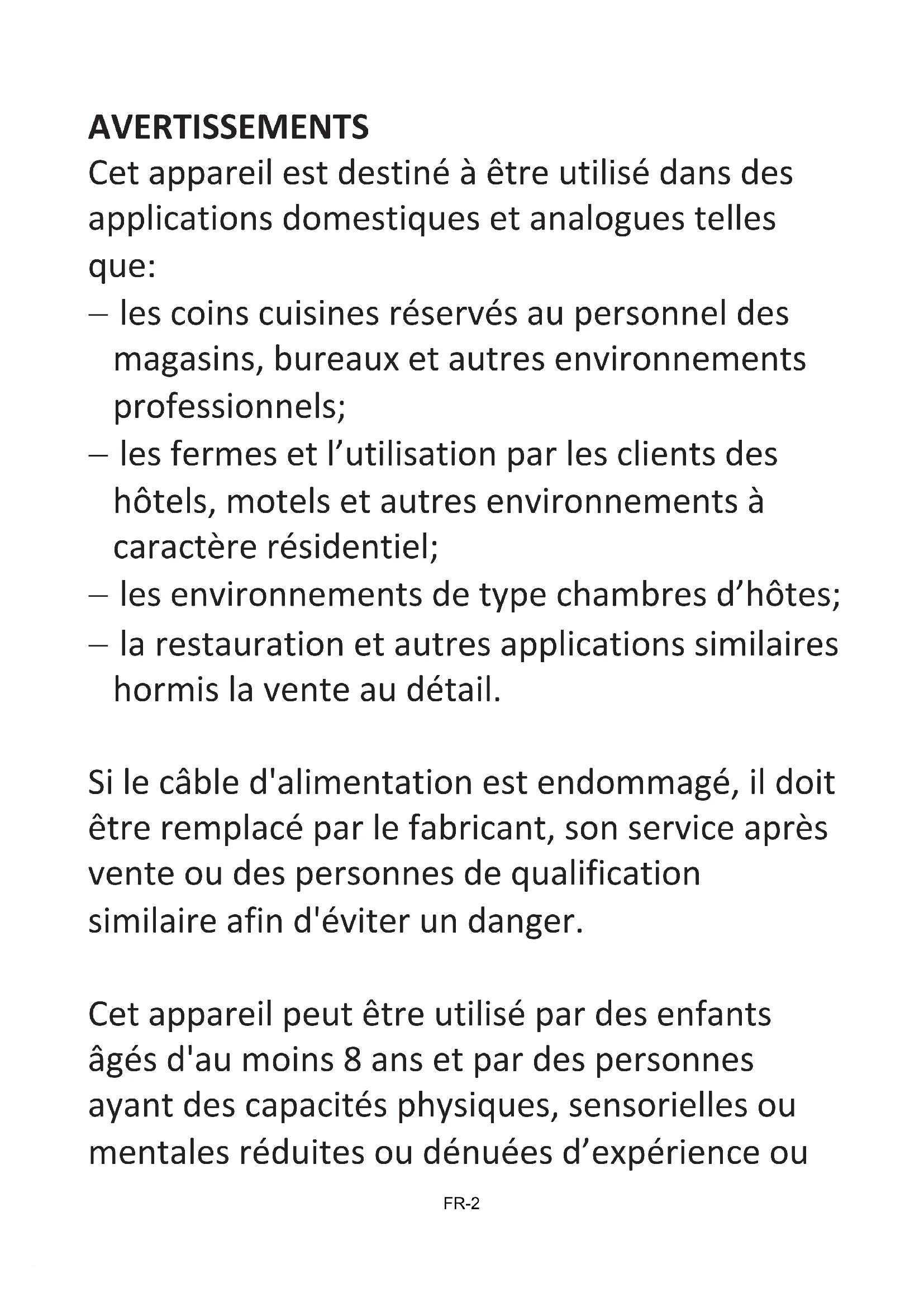 SERVICE DE RÉPARATION ET PIÈCES DE RECHANG...................................................................................... 31 MISE AU REBUT............................................................................................................................................ 32 Tabledesmatires èAVERTISSEMENTS Cet appareil est destiné à être utilisé dans des applications domestiques et analogues telles que: les coins cuisines réservés au personnel des magasins, bureaux et autres environnements professionnels; les fermes et l’utilisation par les clients des hôtels, motels et autres environnements à caractère résidentiel; les environnements de type chambres d’hôtes; la restauration et autres applications similaires hormis la vente au détail. Si le câble d'alimentation est endommagé, il doit être remplacé par le fabricant, son service après vente ou des personnes de qualification similaire afin d'éviter un danger. Cet appareil peut être utilisé par des enfants âgés d'au moins 8 ans et par des personnes ayant des capacités physiques, sensorielles ou mentales réduites ou dénuées d’expérience ou FR-2de connaissance, s'ils (si elles) sont correctement surveillé(e)s ou si des instructions relatives à l'utilisation de l'appareil en toute sécurité leur ont été données et si les risques encourus ont été appréhendés. Les enfants ne doivent pas jouer avec l’appareil. Le nettoyage et l'entretien par l'usager ne doivent pas être effectués par des enfants sans surveillance. En ce qui concerne la méthode du nettoyage, référez-vous à la section “NETTOYAGE ET ENTRETIEN” en page FR-27. Cet appareil ne doit pas être exposé à la pluie. MISE EN GARDE: Maintenir dégagées les ouvertures de ventilation dans l'enceinte de l'appareil ou dans la structure d'encastrement. MISE EN GARDE: Ne pas utiliser de dispositifs mécaniques ou autres moyens pour accélérer le processus de dégivrage autres que ceux recommandés par le fabricant. FR-3 MISE EN GARDE: Ne pas endommager le circuit de réfrigération. MISE EN GARDE: Ne pas utiliser d'appareils électriques à l'intérieur du compartiment de stockage des denrées, à moins qu'ils ne soient du type recommandé par le fabricant. Ne pas stocker dans cet appareil des substances explosives telles que des aérosols contenant des gaz propulseurs inflammables. MISE EN GARDE: Le système de réfrigération est sous haute pression. Ne pas y toucher. Contacter des services d’entretien qualifiés avant la mise au rebut.