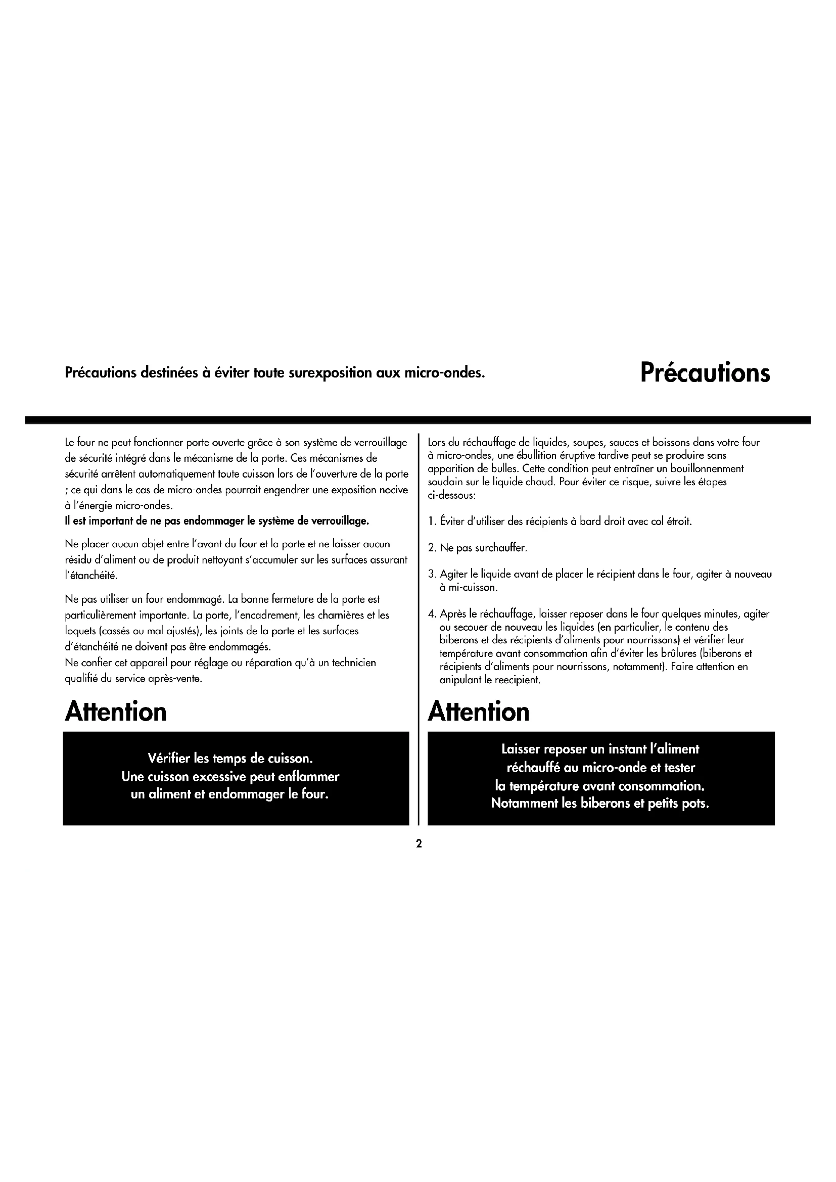 FOUR À MICRO-ONDES LISEZ ATTENTIVEMENT LE PRESENT MANUEL DE L’UTILISATEUR AVANT D’UTILISER L’APPAREIL. FRENCHPlease ensure cooking times are correctly set as over cooking may result in the FOOD catching fire and subsequent damage to your oven. Précautions destinées à éviter toute surexposition aux micro-ondes. Précautions Le four ne peut fonctionner porte ouverte grâce à son système de verrouillage de sécurité intégré dans le mécanisme de la porte. Ces mécanismes de sécurité arrêtent automatiquement toute cuisson lors de l’ouverture de la porte ; ce qui dans le cas de micro-ondes pourrait engendrer une exposition nocive à l’énergie micro-ondes. Il est important de ne pas endommager le système de verrouillage. Ne placer aucun objet entre l’avant du four et la porte et ne laisser aucun résidu d’aliment ou de produit nettoyant s’accumuler sur les surfaces assurant l’étanchéité. Ne pas utiliser un four endommagé. La bonne fermeture de la porte est particulièrement importante. La porte, l’encadrement, les charnières et les loquets (cassés ou mal ajustés), les joints de la porte et les surfaces d’étanchéité ne doivent pas être endommagés. Ne confier cet appareil pour réglage ou réparation qu’à un technicien qualifié du service après-vente. Attention Lors du réchauffage de liquides, soupes, sauces et boissons dans votre four à micro-ondes, une ébullition éruptive tardive peut se produire sans apparition de bulles. Cette condition peut entraîner un bouillonnenment soudain sur le liquide chaud. Pour éviter ce risque, suivre les étapes ci-dessous: