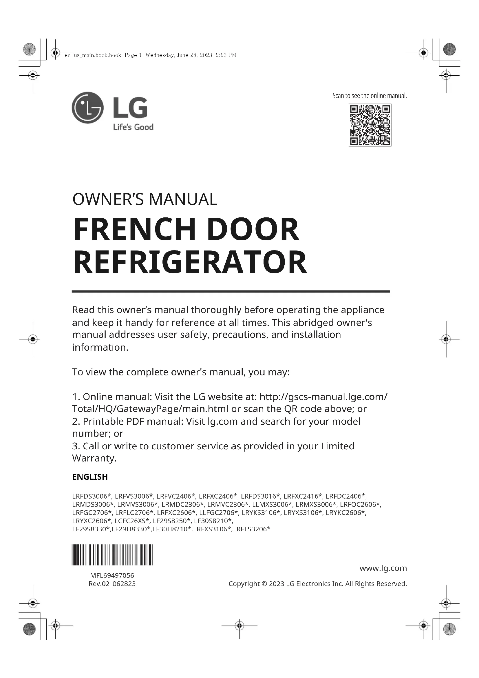 DEUX BATTANTS FRANÇAIS LRFDS3006*, LRFVS3006*, LRFVC2406*, LRFXC2406*, LRFDS3016*, LRFXC2416*, LRFDC2406*, LRMDS3006*, LRMVS3006*, LRMDC2306*, LRMVC2306*, LLMXS3006*, LRMXS3006*, LRFOC2606*, LRFGC2706*, LRFLC2706*, LRFXC2606*, LLFGC2706*, LRYKS3106*, LRYXS3106*, LRYKC2606*, LRYXC2606*, LCFC26XS*, LF29S8250*, LF30S8210*, LF29S8330*,LF29H8330*,LF30H8210*,LRFXS3106*,LRFLS3206* www.lg.com Copyright © 2023 LG Electronics Inc. Tous droits réservés Veuillez lire soigneusement le présent manuel d'utilisation avant de faire fonctionner l'appareil et conservez-le à portée de la main pour le consult- er en tout temps. Cette version abrégée traite d'avis sécuritaires pour l'utilisateur, précautions et informations d'installation. Pour consulter le manuel intégral, vous pouvez :