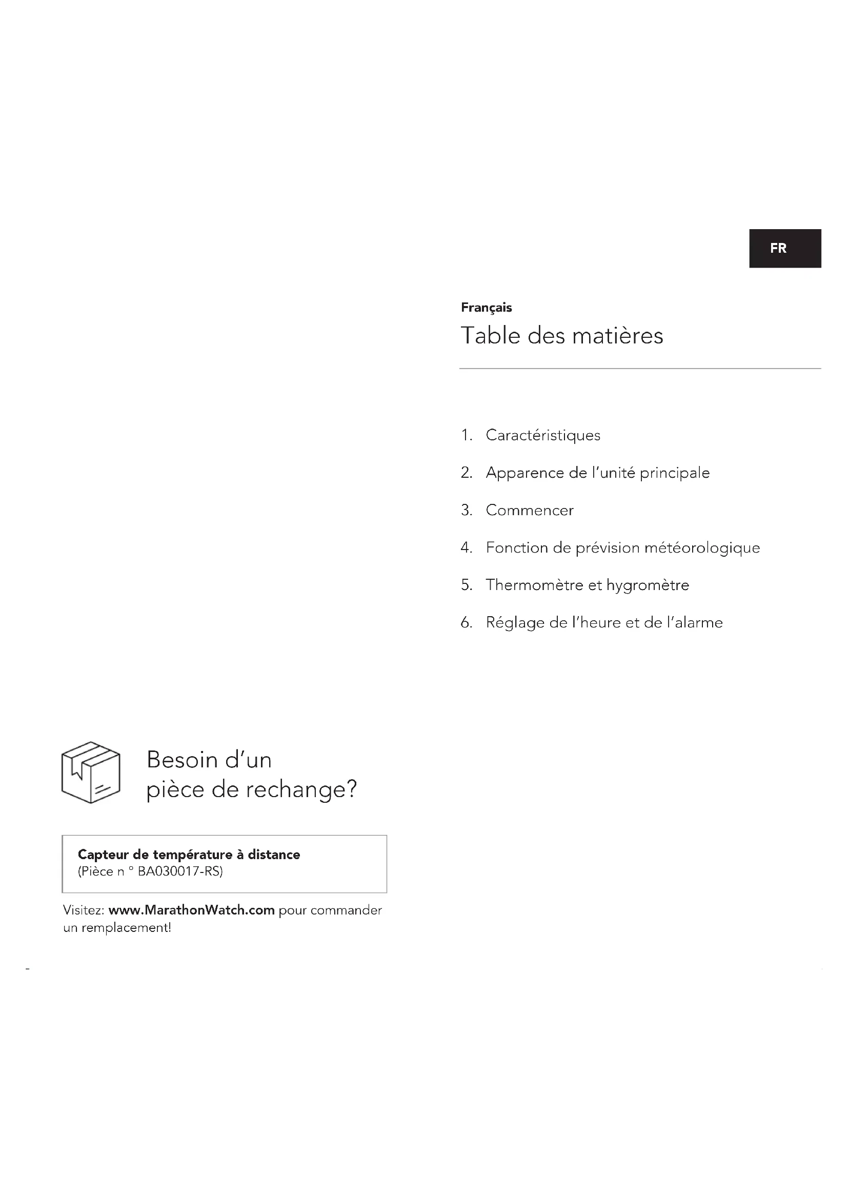| FR | EN | IT | DE | ES | NL | Lisbon Station Météo avec Grand Écran Couleur Weather Station with Large Colour Display Stazione Meteo con Ampio Display a Colori Wetterstation mit großem Farbdisplay Weerstation met grote kleurendisplayFR Capteur de température à distance (Pièce n ° BA030017-RS) Besoin d’un pièce de rechange? Visitez: www.MarathonWatch.com pour commander un remplacement! Table des matières Français