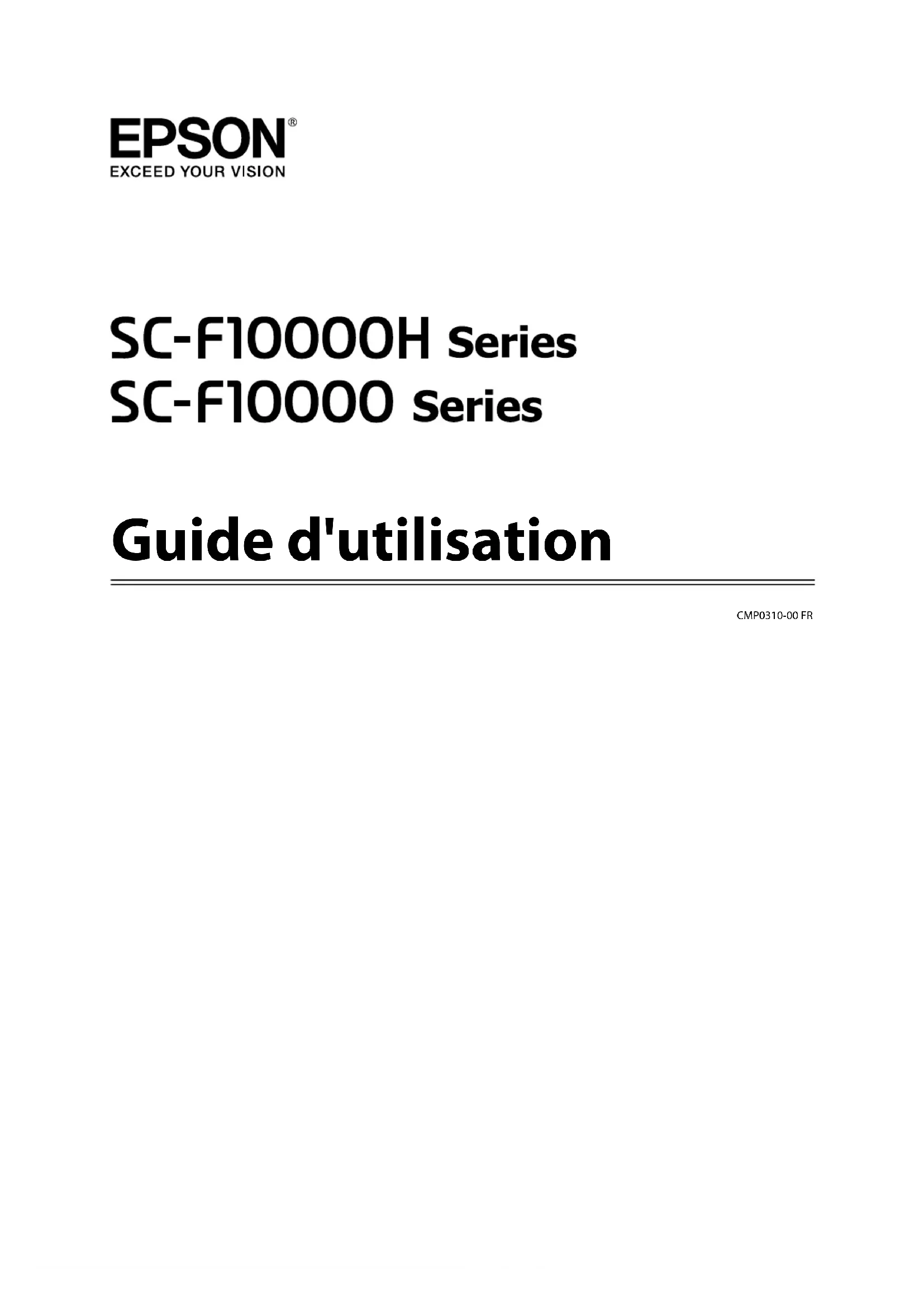 - is trademarks of Google LLC. Avis général : les autres noms de produit utilisés dans cette notice sont donnés uniquement à titre d’identification et peuvent être des noms de marque de leurs détenteurs respectifs. Epson dénie toute responsabilité vis-à-vis de ces marques. © 2021 Seiko Epson Corporation. SC-F10000H Series/SC-F10000 Series Guide d'utilisation Copyrights et marques 2Remarque à l’attention des utilisateurs en Amérique du Nord et en Amérique latine IMPORTANT : avant d’utiliser ce produit, veuillez consulter les instructions de sécurité contenues dans les Notices (Avertissements) en ligne. SC-F10000H Series/SC-F10000 Series Guide d'utilisation Copyrights et marques 3Table des matières Copyrights et marques Remarque à l’attention des utilisateurs en Amérique du Nord et en Amérique latine p. 3