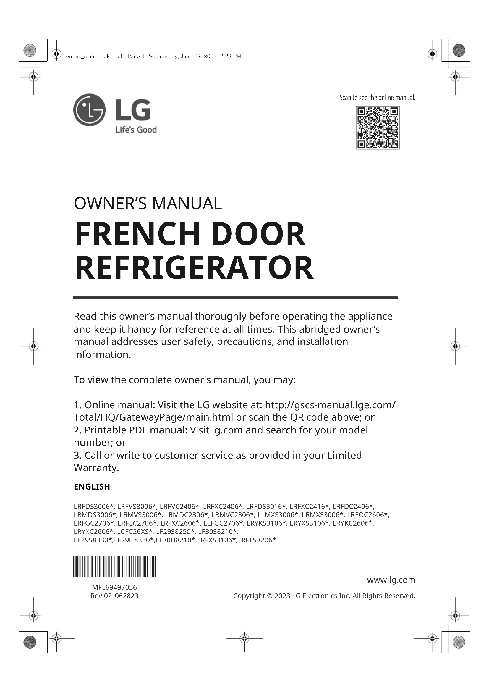 DEUX BATTANTS FRANÇAIS LRFDS3006*, LRFVS3006*, LRFVC2406*, LRFXC2406*, LRFDS3016*, LRFXC2416*, LRFDC2406*, LRMDS3006*, LRMVS3006*, LRMDC2306*, LRMVC2306*, LLMXS3006*, LRMXS3006*, LRFOC2606*, LRFGC2706*, LRFLC2706*, LRFXC2606*, LLFGC2706*, LRYKS3106*, LRYXS3106*, LRYKC2606*, LRYXC2606*, LCFC26XS*, LF29S8250*, LF30S8210*, LF29S8330*,LF29H8330*,LF30H8210*,LRFXS3106*,LRFLS3206* www.lg.com Copyright © 2023 LG Electronics Inc. Tous droits réservés Veuillez lire soigneusement le présent manuel d'utilisation avant de faire fonctionner l'appareil et conservez-le à portée de la main pour le consult- er en tout temps. Cette version abrégée traite d'avis sécuritaires pour l'utilisateur, précautions et informations d'installation. Pour consulter le manuel intégral, vous pouvez :