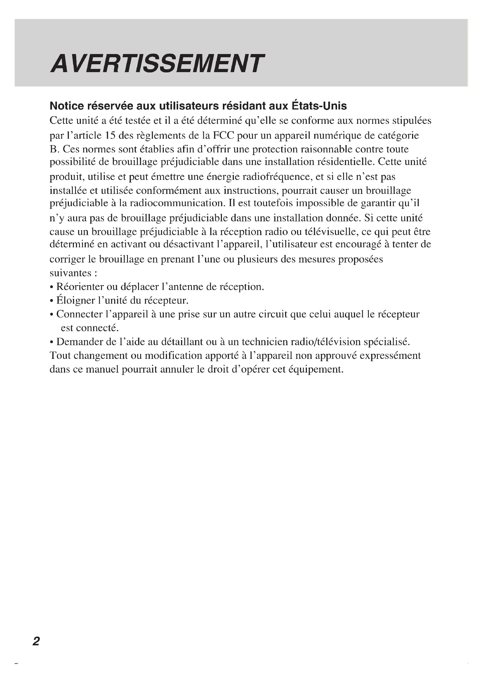 WARRANTIES OF MERCHANTABILITY AND FITNESS FOR A PARTICULAR PURPOSE, ARE LIMITED IN DURATION TO THE DURATION OF THIS WARRANTY. IN NO EVENT SHALL SCEA BE LIABLE FOR CONSEQUENTIAL OR INCIDENTAL DAMAGES FOR BREACH OF ANY EXPRESS OR IMPLIED WARRANTY ON THIS PRODUCT. SOME STATES OR PROVINCES DO NOT ALLOW LIMITATION ON HOW LONG AN IMPLIED WARRANTY LASTS AND SOME STATES DO NOT ALLOW THE EXCLUSION OR LIMITATIONS OF CONSEQUENTIAL OR INCIDENTAL DAMAGES, SO THE ABOVE LIMITATIONS OR EXCLUSION MAY NOT APPLY TO YOU. This warranty gives you specific legal rights, and you may also have other rights which vary from state to state or province to province. This warranty is valid only in the United States and Canada. LIMITED WARRANTY (continued)2 AVERTISSEMENT Notice réservée aux utilisateurs résidant aux États-Unis Cette unité a été testée et il a été déterminé qu’elle se conforme aux normes stipulées par l’article 15 des règlements de la FCC pour un appareil numérique de catégorie B. Ces normes sont établies afin d’offrir une protection raisonnable contre toute possibilité de brouillage préjudiciable dans une installation résidentielle. Cette unité produit, utilise et peut émettre une énergie radiofréquence, et si elle n’est pas installée et utilisée conformément aux instructions, pourrait causer un brouillage préjudiciable à la radiocommunication. Il est toutefois impossible de garantir qu’il n’y aura pas de brouillage préjudiciable dans une installation donnée. Si cette unité cause un brouillage préjudiciable à la réception radio ou télévisuelle, ce qui peut être déterminé en activant ou désactivant l’appareil, l’utilisateur est encouragé à tenter de corriger le brouillage en prenant l’une ou plusieurs des mesures proposées suivantes :