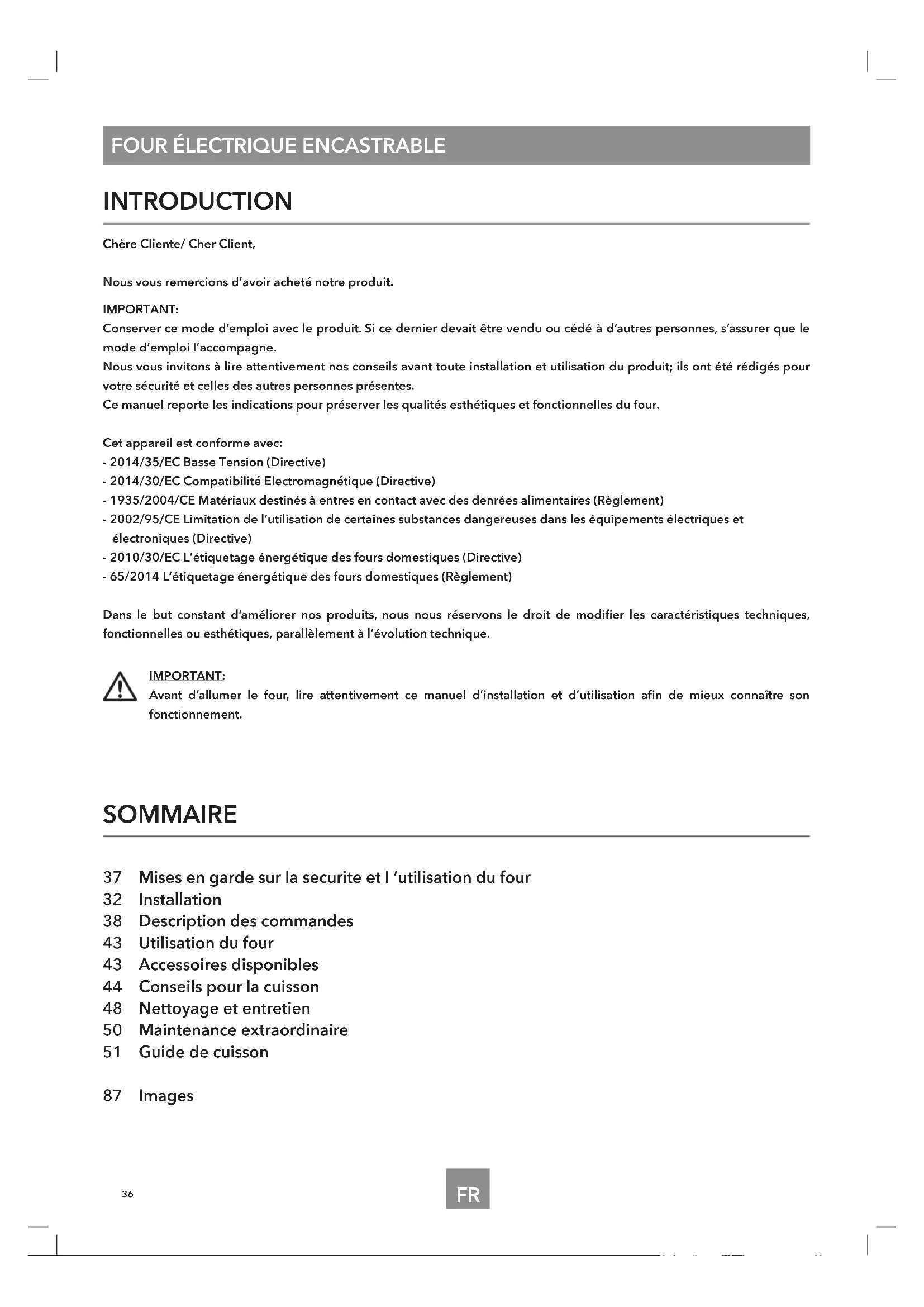 SOMMAIRE 37 Mises en garde sur la securite et l ’utilisation du four 32 Installation 38 Description des commandes 43 Utilisation du four 43 Accessoires disponibles 44 Conseils pour la cuisson 48 Nettoyage et entretien 50 Maintenance extraordinaire 51 Guide de cuisson 87 Images INTRODUCTION Chère Cliente/ Cher Client, Nous vous remercions d’avoir acheté notre produit. IMPORTANT: Conserver ce mode d’emploi avec le produit. Si ce dernier devait être vendu ou cédé à d’autres personnes, s’assurer que le mode d’emploi l’accompagne. Nous vous invitons à lire attentivement nos conseils avant toute installation et utilisation du produit; ils ont été rédigés pour votre sécurité et celles des autres personnes présentes. Ce manuel reporte les indications pour préserver les qualités esthétiques et fonctionnelles du four. Cet appareil est conforme avec: - 2014/35/EC Basse Tension (Directive) - 2014/30/EC Compatibilité Electromagnétique (Directive) - 1935/2004/CE Matériaux destinés à entres en contact avec des denrées alimentaires (Règlement) - 2002/95/CE Limitation de l’utilisation de certaines substances dangereuses dans les équipements électriques et électroniques (Directive) - 2010/30/EC L’étiquetage énergétique des fours domestiques (Directive) - 65/2014 L’étiquetage énergétique des fours domestiques (Règlement) Dans le but constant d’améliorer nos produits, nous nous réservons le droit de modier les caractéristiques techniques, fonctionnelles ou esthétiques, parallèlement à l’évolution technique. IMPORTANT: Avant d’allumer le four, lire attentivement ce manuel d’installation et d’utilisation an de mieux connaître son fonctionnement.