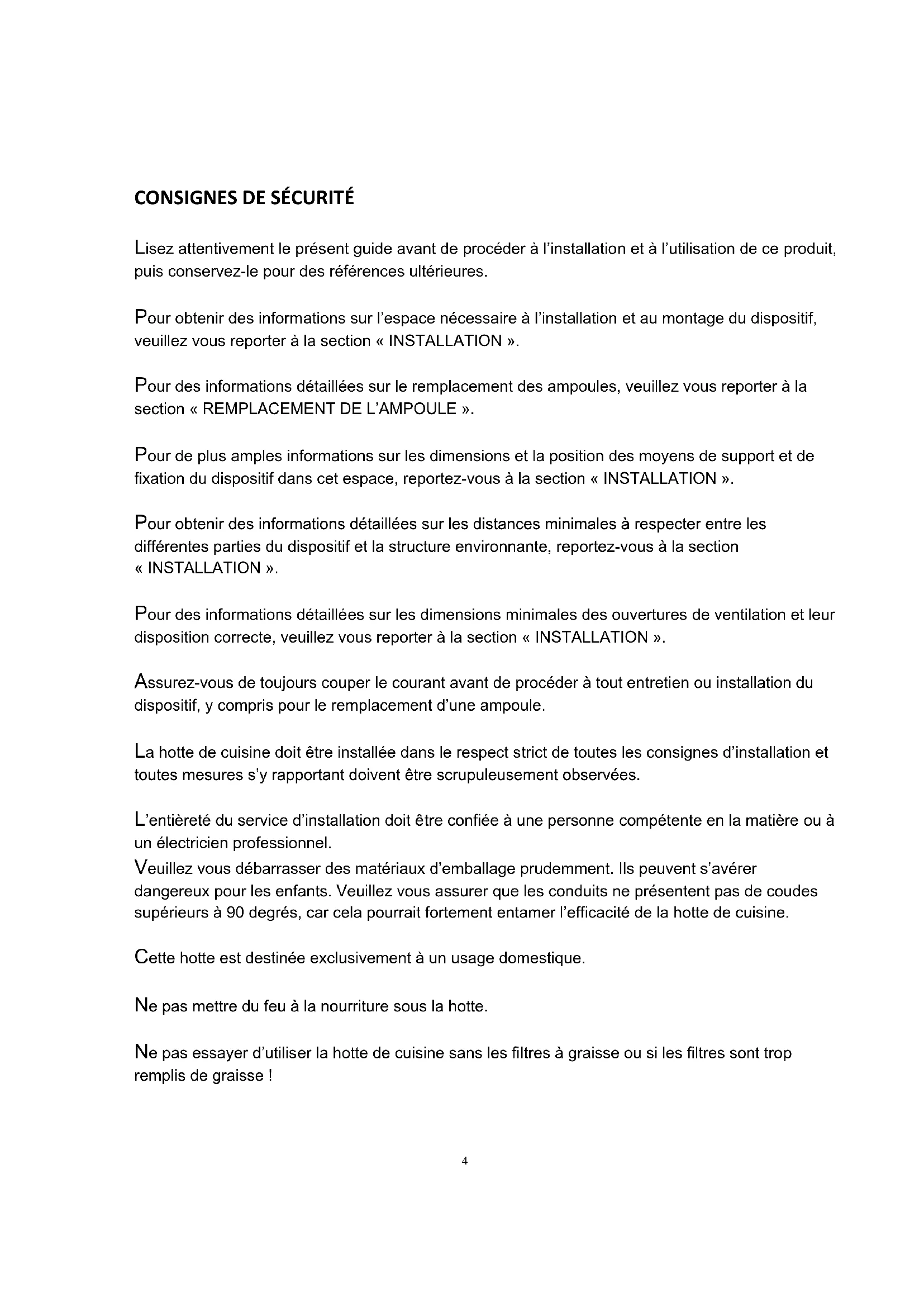 L’entièreté du service d’installation doit être confiée à une personne compétente en la matière ou à un électricien professionnel. Veuillez vous débarrasser des matériaux d’emballage prudemment. Ils peuvent s’avérer dangereux pour les enfants. Veuillez vous assurer que les conduits ne présentent pas de coudes supérieurs à 90 degrés, car cela pourrait fortement entamer l’efficacité de la hotte de cuisine. Cette hotte est destinée exclusivement à un usage domestique.