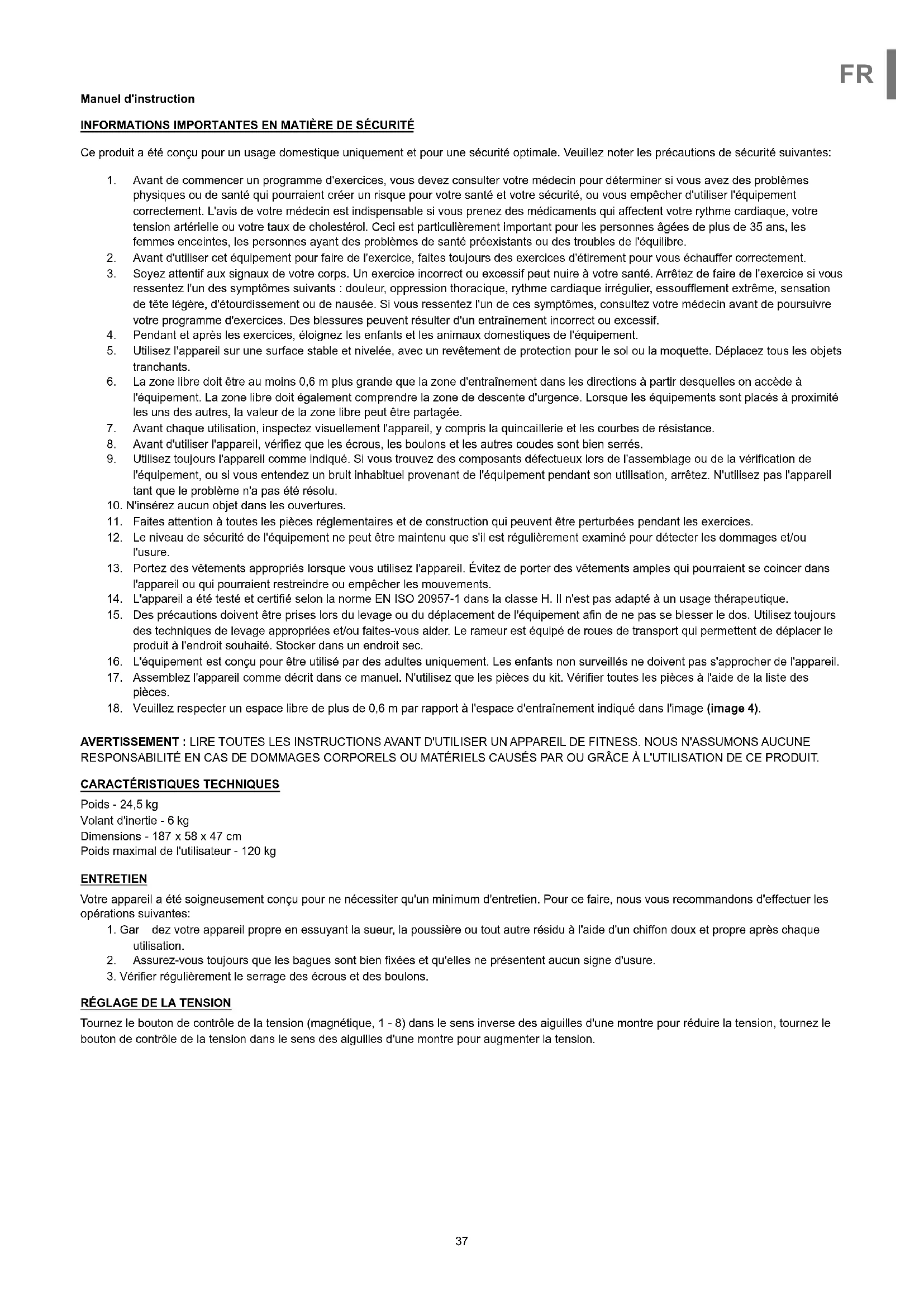 - L'appareil a ete teste et certifie selon la norme EN ISO 20957-1 dans la classe H. Il n'est pas adapte a un usage therapeutique.