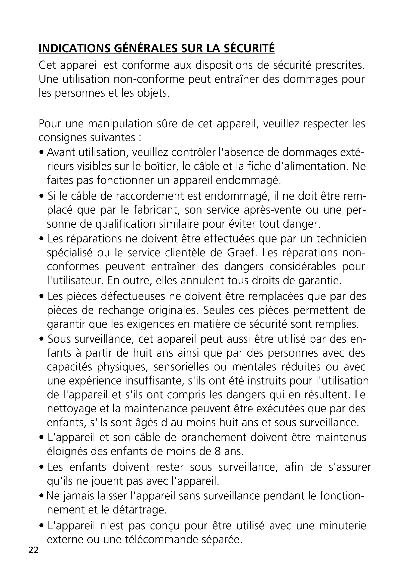 - Les réparations ne doivent être effectuées que par un technicien spécialisé ou le service clientèle de Graef. Les réparations non- conformes peuvent entraîner des dangers considérables pour l'utilisateur. En outre, elles annulent tous droits de garantie.