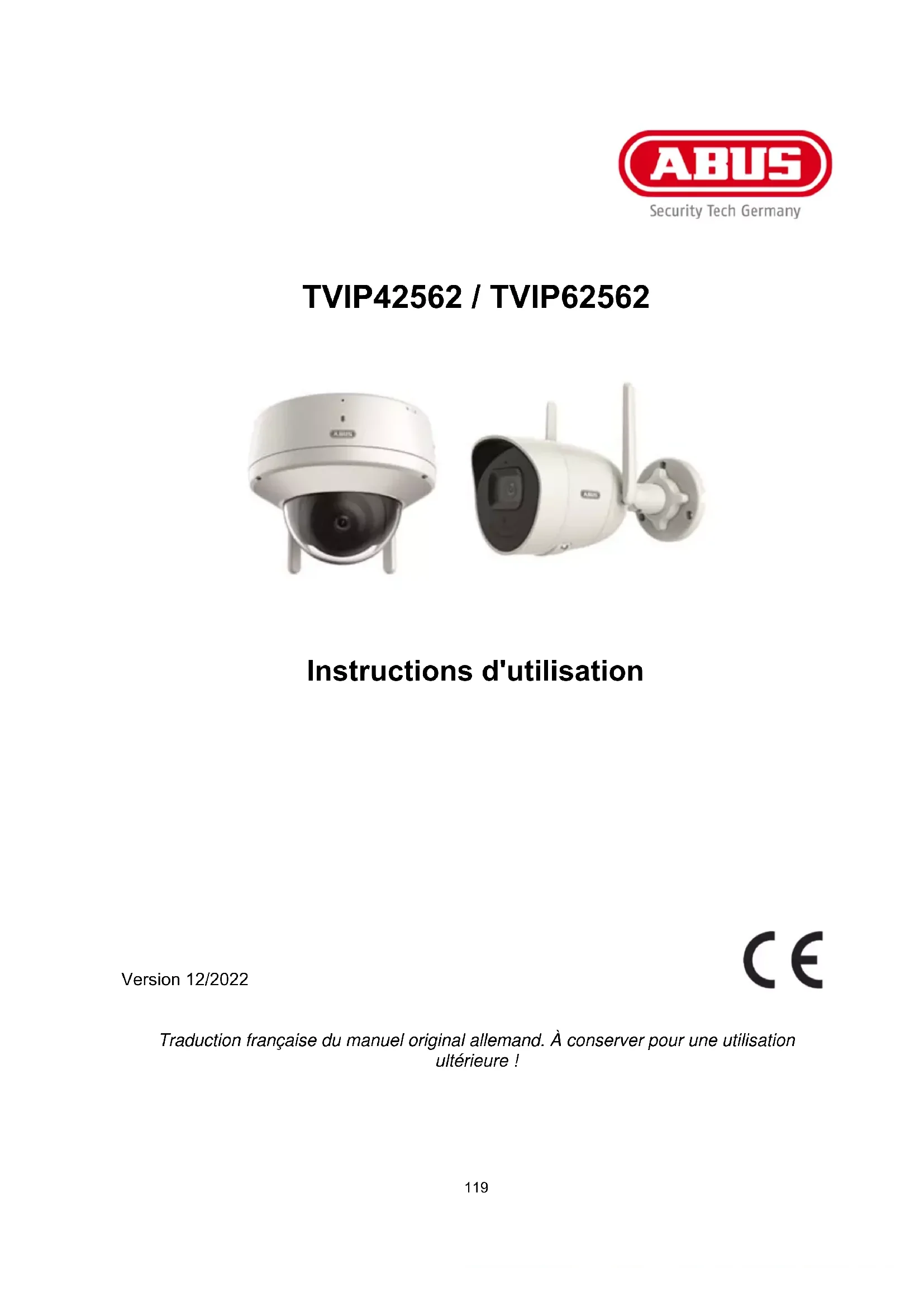 Chère Cliente, cher Client, Nous vous remercions d’avoir choisi ce produit. TVIP42562 ABUS Security-Center déclare par la présente que le dispositif TVIP42562 est conforme à la directive RED 2014/53/EU. En outre, l’appareil est conforme aux exigences des directives européennes suivantes : directive CEM 2014/30/UE et directive RoHS 2011/65/UE. Le texte intégral de la déclaration de conformité de l'UE est disponible à l'adresse Internet suivante : www.abus.com/TVIP42562 Lorsque vous utilisez ce produit, respectez les consignes du manuel d’utilisation afin de ne pas altérer la conformité du produit et sa sécurité de fonctionnement ! TVIP62562 ABUS Security-Center déclare par la présente que le dispositif TVIP62562 est conforme à la directive RED 2014/53/EU. En outre, l’appareil est conforme aux exigences des directives européennes suivantes : directive CEM 2014/30/UE et directive RoHS 2011/65/UE. Le texte intégral de la déclaration de conformité de l'UE est disponible à l'adresse Internet suivante : www.abus.com/TVIP62562 Lorsque vous utilisez ce produit, respectez les consignes du manuel d’utilisation afin de ne pas altérer la conformité du produit et sa sécurité de fonctionnement !