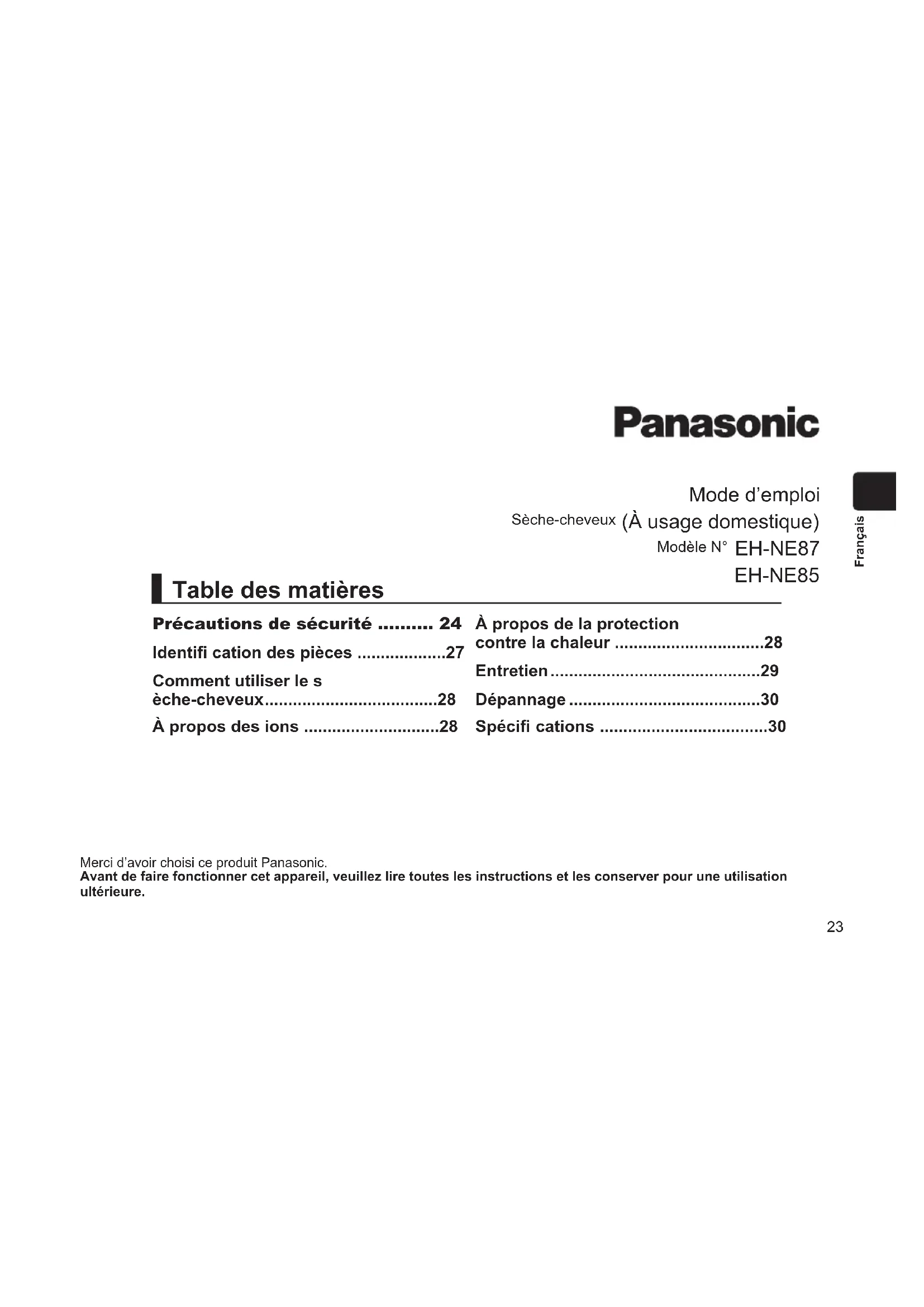 EHNE85 - Sèche-cheveux PANASONIC - Notice d'utilisation et mode d'emploi gratuit