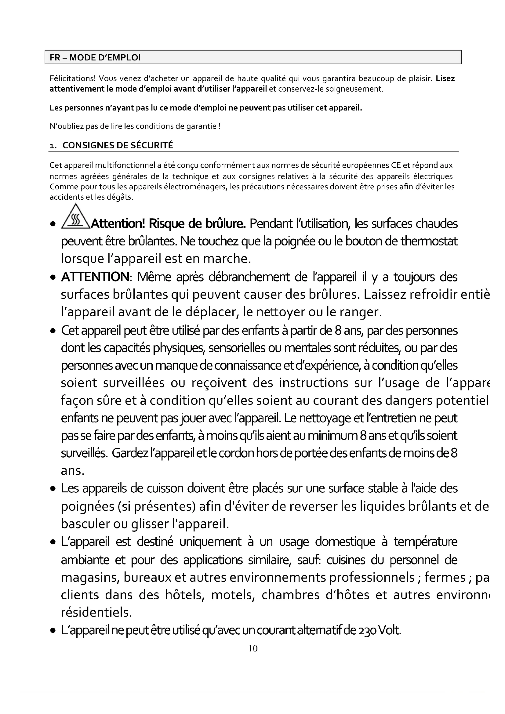 - Attention! Risque de brûlure. Pendant l’utilisation, les surfaces chaudes peuvent être brûlantes. Ne touchez que la poignée ou le bouton de thermostat lorsque l’appareil est en marche.