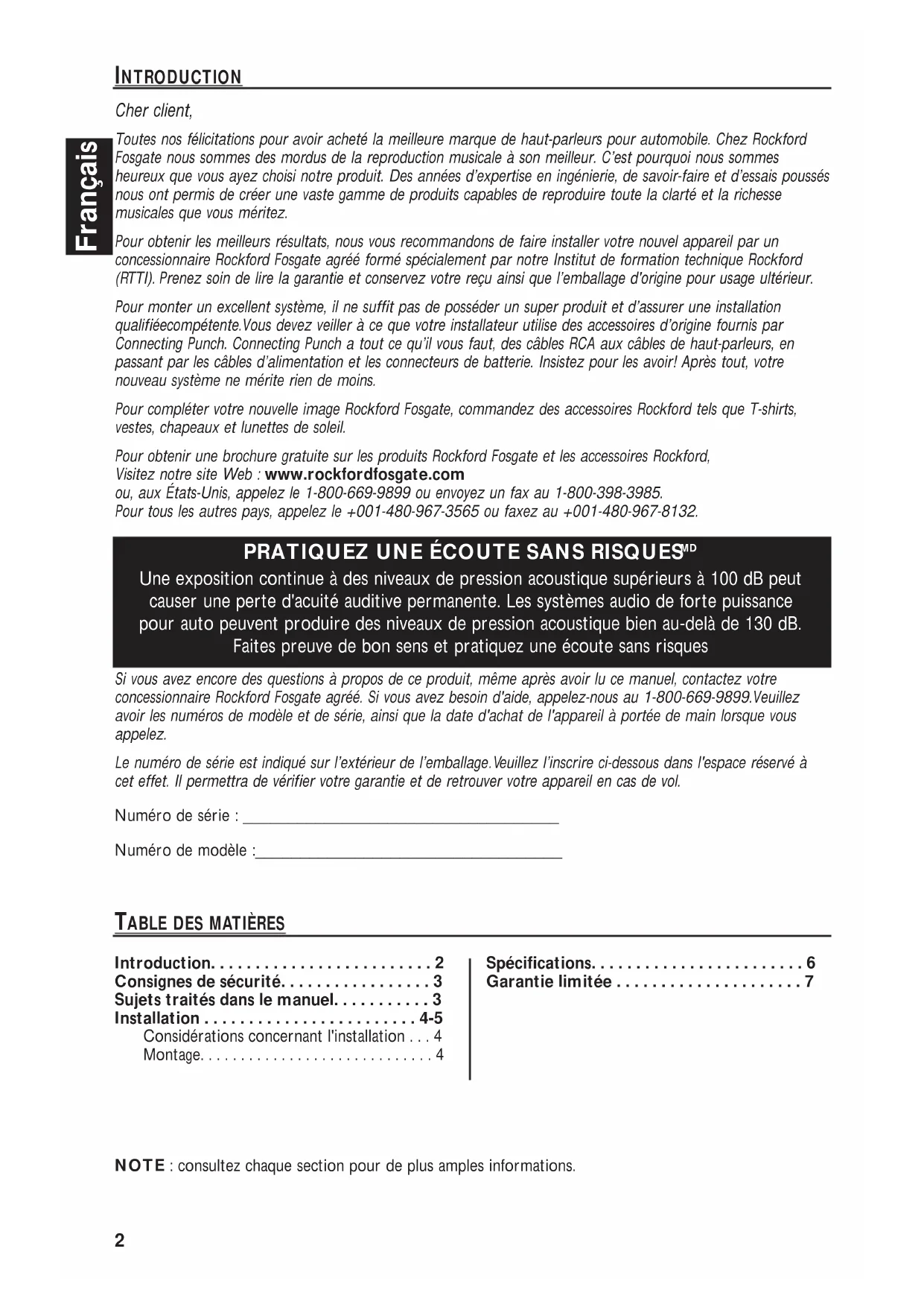 Bienvenue à Rockford Fosgate! Ce manuel vise à informer le propriétaire, le vendeur et l'installateur de l'appareil. Si vous désirez apprendre rapidement comment installer ce produit, consultez la section Installation du manuel. Reportez-vous à la Table des matières pour d'autres informations. Nous nous efforçons de faire en sorte que toutes les informations contenues dans ce manuel soient à jour. Mais comme nous améliorons constamment nos produits, nous nous réservons le droit de modifier ces informations sans aucun préavis.