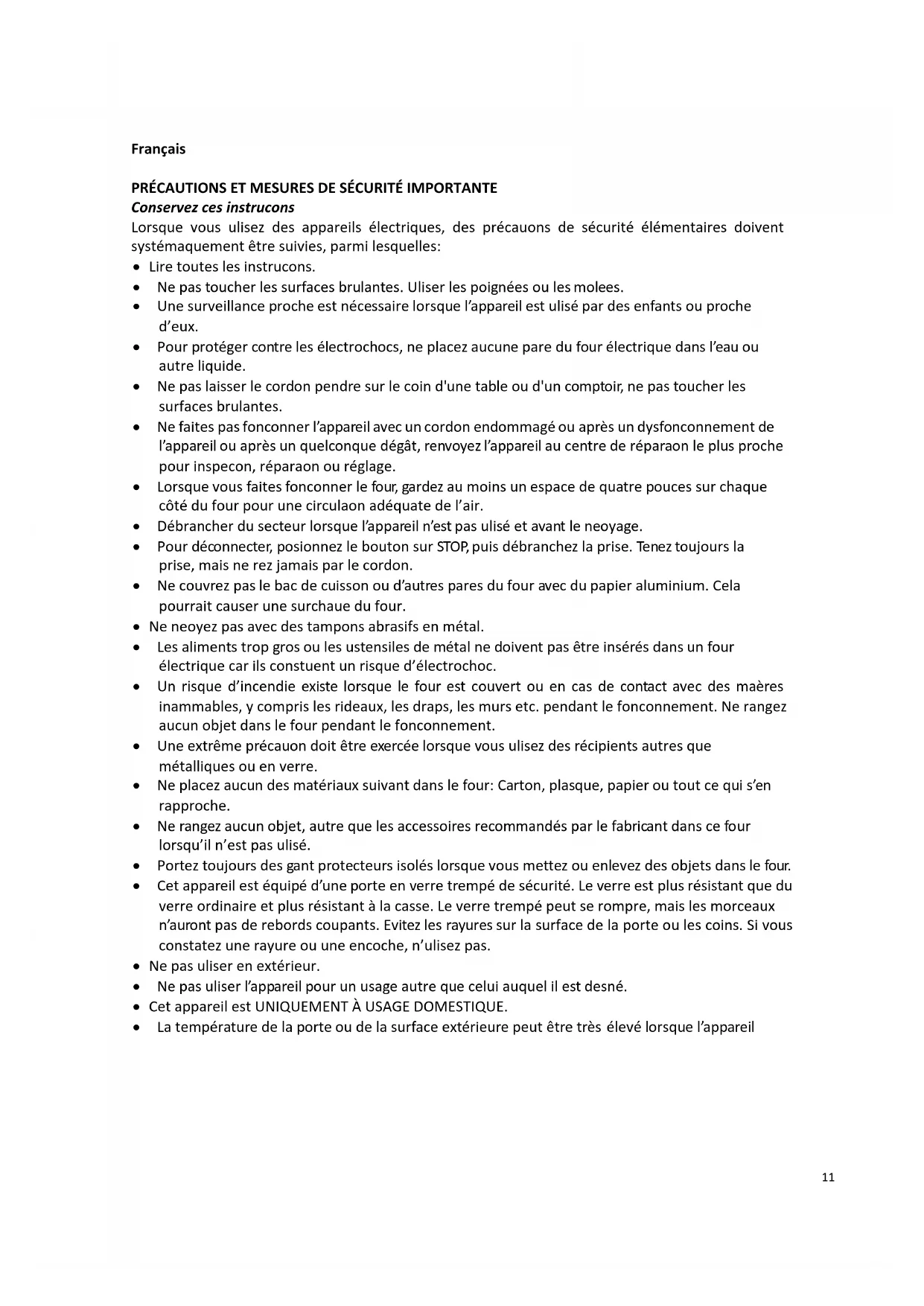 Avant utilisation: Avant d’utiliser votre four électrique pour la première fois, assurez-vous de: Lisez toutes les instructions comprises dans ce manuel. Assurez-vous que le four est débranché et que la molette du minuteur est sur la position « OFF ». Enlevez tous les accessoires. Lavez dans de l’eau chaude ou au lave-vaisselle. Séchez bien tous les accessoires et réassemblez-les dans le four. Branchez le four dans la prise lorsque vous êtes prêt à utiliser votre nouveau four avec la grille pour griller et le bac de nourriture. De la fumée ou une odeur peut être émise lors de la première utilisation. Cela est normal. Cela est dû à la substance protective sur les éléments chauffants, qui évite les effets salant pendant le transport depuis l’usine. Donc il est recommandé de faire fonctionner le four à vide pendant 15 minutes lors de la première utilisation, par ailleurs assurez-vous de maintenir une bonne ventilation dans la pièce. Quand commencer à utiliser: Confirmez que la consommation d'énergie indiquée est conforme à l'alimentation électrique de votre maison. Ne laissez pas le cordon pendre sur le bord de la table ou du comptoir pour éviter que les enfants ne trébuchent. Si le cordon d'alimentation est endommagé, le four ne doit pas être utilisé avant d'avoir été réparé. Le four doit être envoyé au fabricant, à un agent de service autorisé ou à une personne qualifiée afin d'éviter tout danger. Cet appareil est doté d'un cordon d'alimentation court pour réduire le risque de s'emmêler ou de trébucher sur un long cordon. Une rallonge peut être utilisée si vous faites preuve de prudence dans son utilisation: La puissance électrique de la rallonge doit être au moins aussi élevée que celle de l'appareil.13 Une rallonge avec le cordon d'alimentation doit être disposée de façon à ce qu'elle ne puisse pas s'enrouler sur le comptoir ou sur le dessus de table à un endroit où les enfants pourraient les tirer ou les faire trébucher par accident.