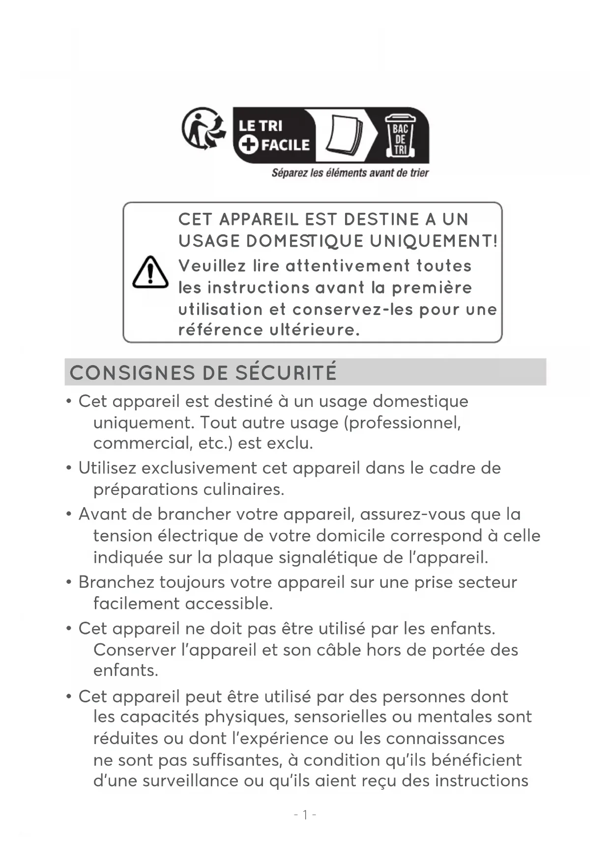 USAGE DOMES TIQUE UNIQUEMENT! Veuillez lire attentivement toutes les instructions avant la première utilisation et conservez-les pour une référence ultérieure.- 2 - quant à l’utilisation de l’appareil en toute sécurité et dans la mesure où ils en comprennent bien les dangers potentiels.