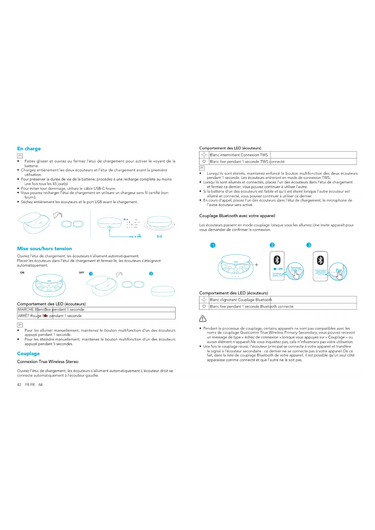 - Pour les éteindre manuellement, maintenez le bouton multifonction d'un des écouteurs appuyé pendant 5 secondes. Couplage Connexion True Wireless Stereo Ouvrez l’étui de chargement, les écouteurs s’allument automatiquement.L’écouteur droit se connecte automatiquement à l’écouteur gauche. Comportement des LED (écouteurs) Blanc intermittent Connexion TWS Blanc xe pendant 1 seconde TWS connecté