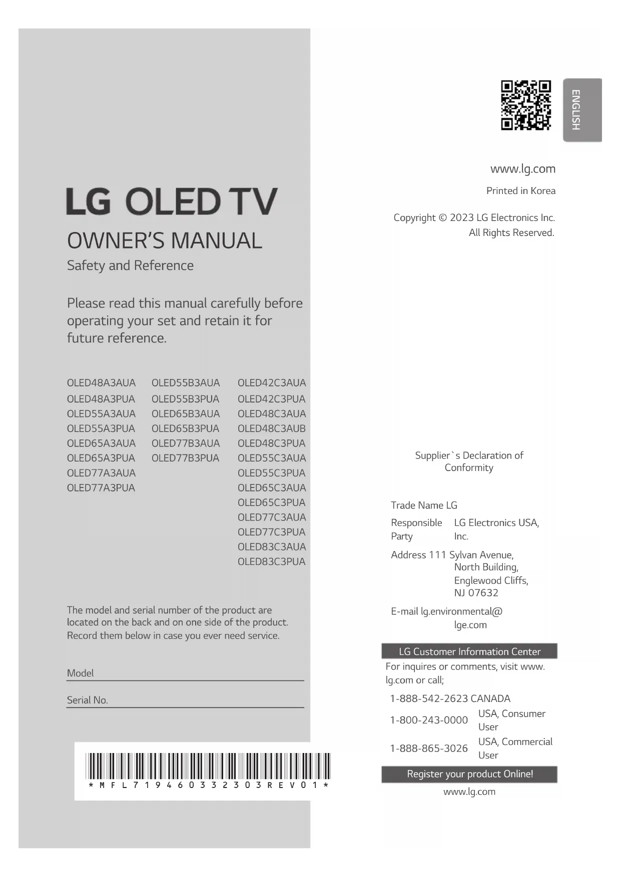 www.lg.com Copyright © 2023 LG Electronics inc. Tous droits réservés. Imprimé en Corée Déclaration de conformité du fournisseur Appellation commerciale
