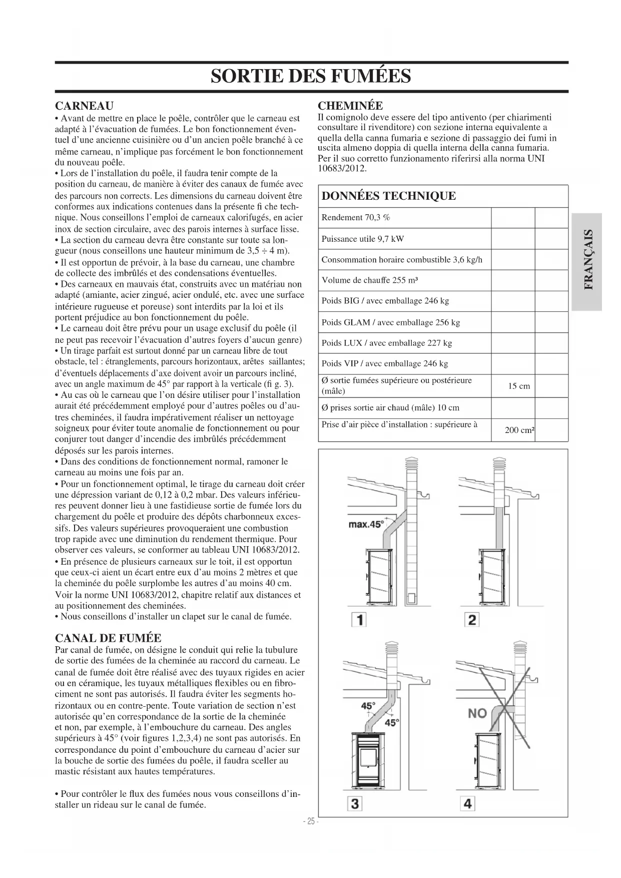 Rendement 70,3 % Puissance utile 9,7 kW Consommation horaire combustible 3,6 kg/h Volume de chauffe 255 m³ Poids BIG / avec emballage 246 kg Poids GLAM / avec emballage 256 kg Poids LUX / avec emballage 227 kg Poids VIP / avec emballage 246 kg Ø sortie fumées supérieure ou postérieure (mâle) 15 cm Ø prises sortie air chaud (mâle) 10 cm Prise d’air pièce d’installation : supérieure à 200 cm² CARNEAU