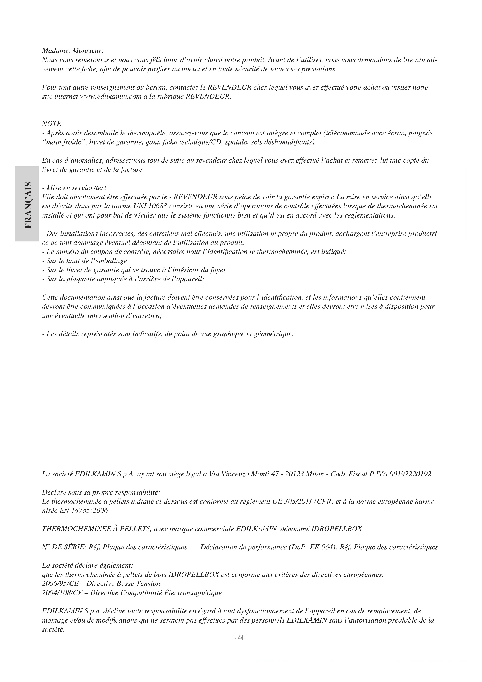 NO. The boiler-Ŏ replace has been designed to burn wood pellets that are 6 mm in diameter. Any other material can damage it. CLEANING ACCESSORIES Ash vacuum cleaner without motor (code 275400) Used for cleaning the hearth GlassKamin (code 155240) Used for cleaning the ceramic glass- 44 - FRANÇAIS Madame, Monsieur, Nous vous remercions et nous vous félicitons d’avoir choisi notre produit. Avant de l’utiliser, nous vous demandons de lire attenti- vement cette fi che, afi n de pouvoir profi ter au mieux et en toute sécurité de toutes ses prestations. Pour tout autre renseignement ou besoin, contactez le REVENDEUR chez lequel vous avez effectué votre achat ou visitez notre site internet www.edilkamin.com à la rubrique REVENDEUR. NOTE - Après avoir désemballé le thermopoêle, assurez-vous que le contenu est intègre et complet (télécommande avec écran, poignée “main froide”, livret de garantie, gant, fi che technique/CD, spatule, sels déshumidifi ants). En cas d’anomalies, adressezvous tout de suite au revendeur chez lequel vous avez effectué l’achat et remettez-lui une copie du livret de garantie et de la facture. - Mise en service/test Elle doit absolument être effectuée par le - REVENDEUR sous peine de voir la garantie expirer. La mise en service ainsi qu’elle est décrite dans par la norme UNI 10683 consiste en une série d’opérations de contrôle effectuées lorsque de thermocheminée est installé et qui ont pour but de vérifi er que le système fonctionne bien et qu’il est en accord avec les règlementations. - Des installations incorrectes, des entretiens mal effectués, une utilisation impropre du produit, déchargent l’entreprise productri- ce de tout dommage éventuel découlant de l’utilisation du produit. - Le numéro du coupon de contrôle, nécessaire pour l’identifi cation le thermocheminée, est indiqué: - Sur le haut de l’emballage - Sur le livret de garantie qui se trouve à l’intérieur du foyer - Sur la plaquette appliquée à l’arrière de l’appareil; Cette documentation ainsi que la facture doivent être conservées pour l’identifi cation, et les informations qu’elles contiennent devront être communiquées à l’occasion d’éventuelles demandes de renseignements et elles devront être mises à disposition pour une éventuelle intervention d’entretien; - Les détails représentés sont indicatifs, du point de vue graphique et géométrique. La societé EDILKAMIN S.p.A. ayant son siège légal à Via Vincenzo Monti 47 - 20123 Milan - Code Fiscal P.IVA 00192220192 Déclare sous sa propre responsabilité: Le thermocheminée à pellets indiqué ci-dessous est conforme au règlement UE 305/2011 (CPR) et à la norme européenne harmo- nisée EN 14785:2006 THERMOCHEMINÉE À PELLETS, avec marque commerciale EDILKAMIN, dénommé IDROPELLBOX N° DE SÉRIE: Réf. Plaque des caractéristiques Déclaration de performance (DoP- EK 064): Réf. Plaque des caractéristiques La société déclare également: que les thermocheminée à pellets de bois IDROPELLBOX est conforme aux critères des directives européennes: 2006/95/CE – Directive Basse Tension 2004/108/CE – Directive Compatibilité Électromagnétique EDILKAMIN S.p.a. décline toute responsabilité eu égard à tout dysfonctionnement de l’appareil en cas de remplacement, de montage et/ou de modifi cations qui ne seraient pas effectués par des personnels EDILKAMIN sans l’autorisation préalable de la société.- 45 - FRANÇAIS