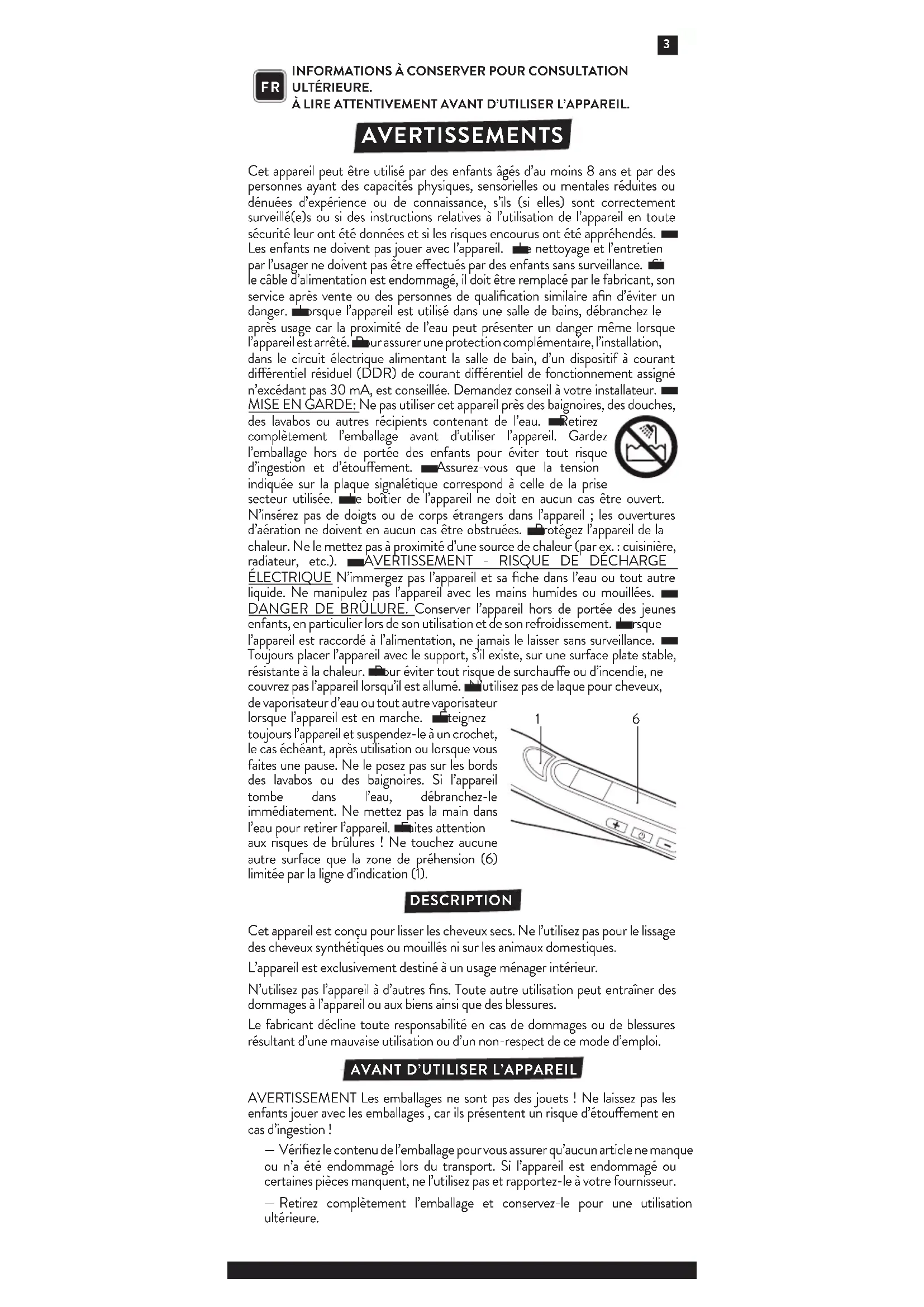 ULTÉRIEURE. À LIRE ATTENTIVEMENT AVANT D’UTILISER L’APPAREIL. AVERTISSEMENTS Cet appareil peut être utilisé par des enfants âgés d’au moins 8 ans et par des personnes ayant des capacités physiques, sensorielles ou mentales réduites ou dénuées d’expérience ou de connaissance, s’ils (si elles) sont correctement surveillé(e)s ou si des instructions relatives à l’utilisation de l’appareil en toute sécurité leur ont été données et si les risques encourus ont été appréhendés. Les enfants ne doivent pas jouer avec l’appareil. Le nettoyage et l’entretien par l’usager ne doivent pas être eectués par des enfants sans surveillance. Si le câble d’alimentation est endommagé, il doit être remplacé par le fabricant, son service après vente ou des personnes de qualification similaire afin d’éviter un danger. Lorsque l’appareil est utilisé dans une salle de bains, débranchez le après usage car la proximité de l’eau peut présenter un danger même lorsque l’appareil est arrêté. Pour assurer une protection complémentaire, l’installation, dans le circuit électrique alimentant la salle de bain, d’un dispositif à courant diérentiel résiduel (DDR) de courant diérentiel de fonctionnement assigné n’excédant pas 30 mA, est conseillée. Demandez conseil à votre installateur. MISE EN GARDE: Ne pas utiliser cet appareil près des baignoires, des douches, des lavabos ou autres récipients contenant de l’eau. Retirez complètement l’emballage avant d’utiliser l’appareil. Gardez l’emballage hors de portée des enfants pour éviter tout risque d’ingestion et d’étouement. Assurez-vous que la tension indiquée sur la plaque signalétique correspond à celle de la prise secteur utilisée. Le boîtier de l’appareil ne doit en aucun cas être ouvert. N’insérez pas de doigts ou de corps étrangers dans l’appareil ; les ouvertures d’aération ne doivent en aucun cas être obstruées. Protégez l’appareil de la chaleur. Ne le mettez pas à proximité d’une source de chaleur (par ex. : cuisinière, radiateur, etc.). AVERTISSEMENT - RISQUE DE DÉCHARGE ÉLECTRIQUE N’immergez pas l’appareil et sa fiche dans l’eau ou tout autre liquide. Ne manipulez pas l’appareil avec les mains humides ou mouillées. DANGER DE BRÛLURE. Conserver l’appareil hors de portée des jeunes enfants, en particulier lors de son utilisation et de son refroidissement. Lorsque l’appareil est raccordé à l’alimentation, ne jamais le laisser sans surveillance. Toujours placer l’appareil avec le support, s’il existe, sur une surface plate stable, résistante à la chaleur. Pour éviter tout risque de surchaue ou d’incendie, ne couvrez pas l’appareil lorsqu’il est allumé. N’utilisez pas de laque pour cheveux, de vaporisateur d’eau ou tout autre vaporisateur lorsque l’appareil est en marche. Éteignez toujours l’appareil et suspendez-le à un crochet, le cas échéant, après utilisation ou lorsque vous faites une pause. Ne le posez pas sur les bords des lavabos ou des baignoires. Si l’appareil tombe dans l’eau, débranchez-le immédiatement. Ne mettez pas la main dans l’eau pour retirer l’appareil. Faites attention aux risques de brûlures ! Ne touchez aucune autre surface que la zone de préhension (6) limitée par la ligne d’indication (1). DESCRIPTION Cet appareil est conçu pour lisser les cheveux secs. Ne l’utilisez pas pour le lissage des cheveux synthétiques ou mouillés ni sur les animaux domestiques. L’appareil est exclusivement destiné à un usage ménager intérieur. N’utilisez pas l’appareil à d’autres fins. Toute autre utilisation peut entraîner des dommages à l’appareil ou aux biens ainsi que des blessures. Le fabricant décline toute responsabilité en cas de dommages ou de blessures résultant d’une mauvaise utilisation ou d’un non-respect de ce mode d’emploi.
