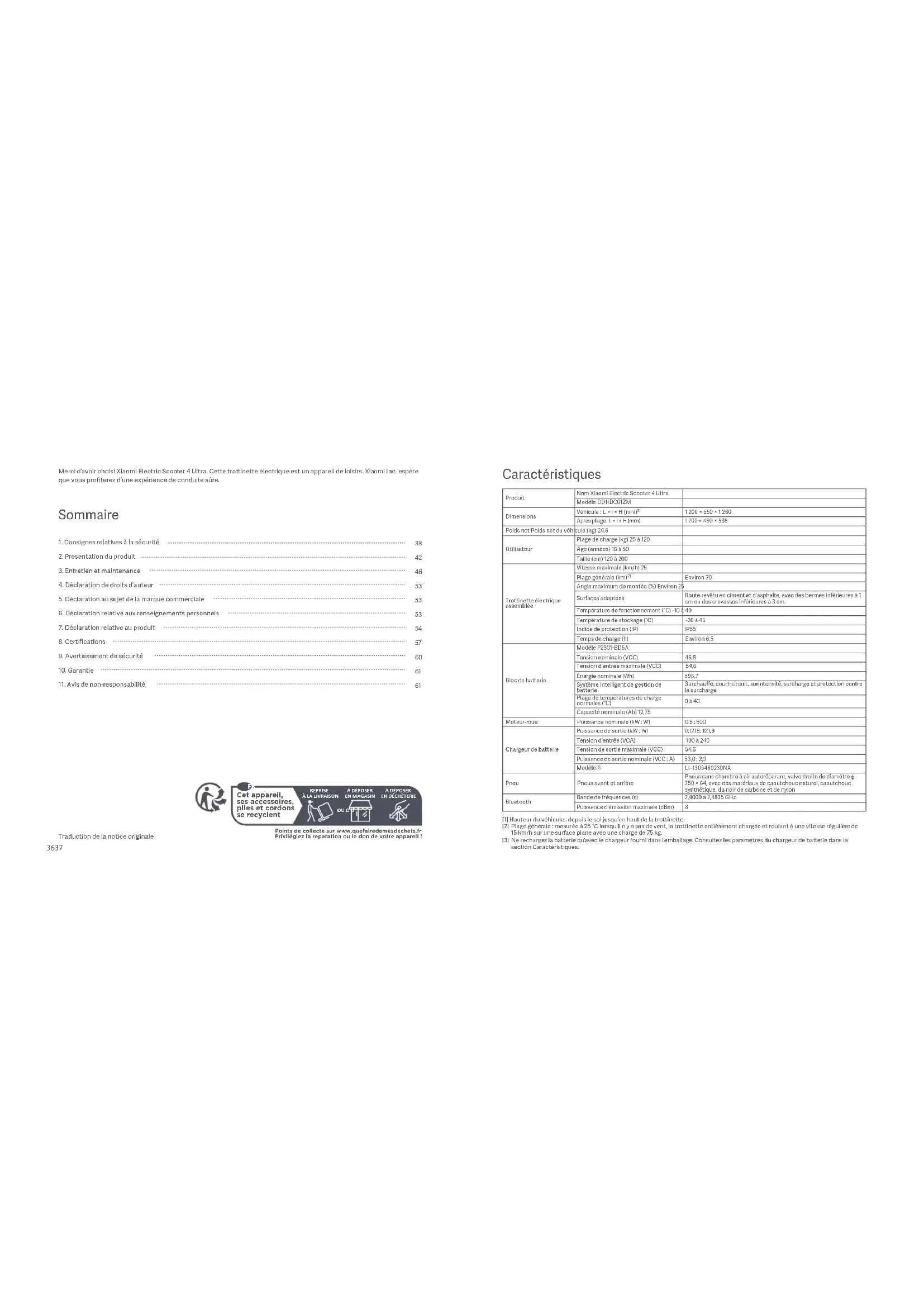 Cet appareil, ses accessoires, piles et cordons se recyclent Points de collecte sur www.quefairedemesdechets.frPrivilégiez la reparation ou le don de votre appareil !REPRISEÀ LA LIVRAISONÀ DÉPOSEREN MAGASINÀ DÉPOSEREN DÉCHÈTERIEOU O U FRFR ProduitNom XiaomiElectricScooter4 UltraModèle DDHBC01ZMDimensionsVéhicule: L×l×H (mm) [1] 1 200 × 550 × 1 260 Après pliage: L×l×H (mm) 1 200 × 490 × 535 Poids net Poids net du véhicule (kg) 24,6UtilisateurPlage de charge (kg) 25 à 120Âge (années) 16 à 50Taille (cm) 120 à 200Trottinette électrique assembléeVitesse maximale (km/h) 25Plage générale (km) [2] Environ 70Angle maximum de montée (%) Environ 25Surfaces adaptéesRoute revêtu en ciment et d’asphalte, avec des bermes inférieures à 1 cm ou des crevasses inférieures à 3 cm.Température de fonctionnement (°C) -10 à 40Température de stockage (°C) -20 à 45Indice de protection (IP) IP55Temps de charge (h) Environ 6,5Bloc de batterieModèle P2301-BD5ATension nominale (VCC) 46,8Tension d’entrée maximale (VCC) 54,6Énergie nominale (Wh) 596,7Système intelligent de gestion de batterieSurchauffe, court-circuit, surintensité, surcharge et protection contre la surchargePlage de températures de charge normales (°C)0 à 40Capacité nominale (Ah) 12,75 Moteur-roue Puissance nominale (kW; W) 0,5; 500 Chargeur de batteriePuissance de sortie (kW; W) 0,1219; 121,9Tension d’entrée (VCA) 100 à 240Tension de sortie maximale (VCC) 54,6 Puissance de sortie nominale (VCC; A) 53,0; 2,3 Modèle [3] LI–1305460230NAPneu Pneus avant et arrièrePneus sans chambre à air autoréparant, valve droite de diamètre