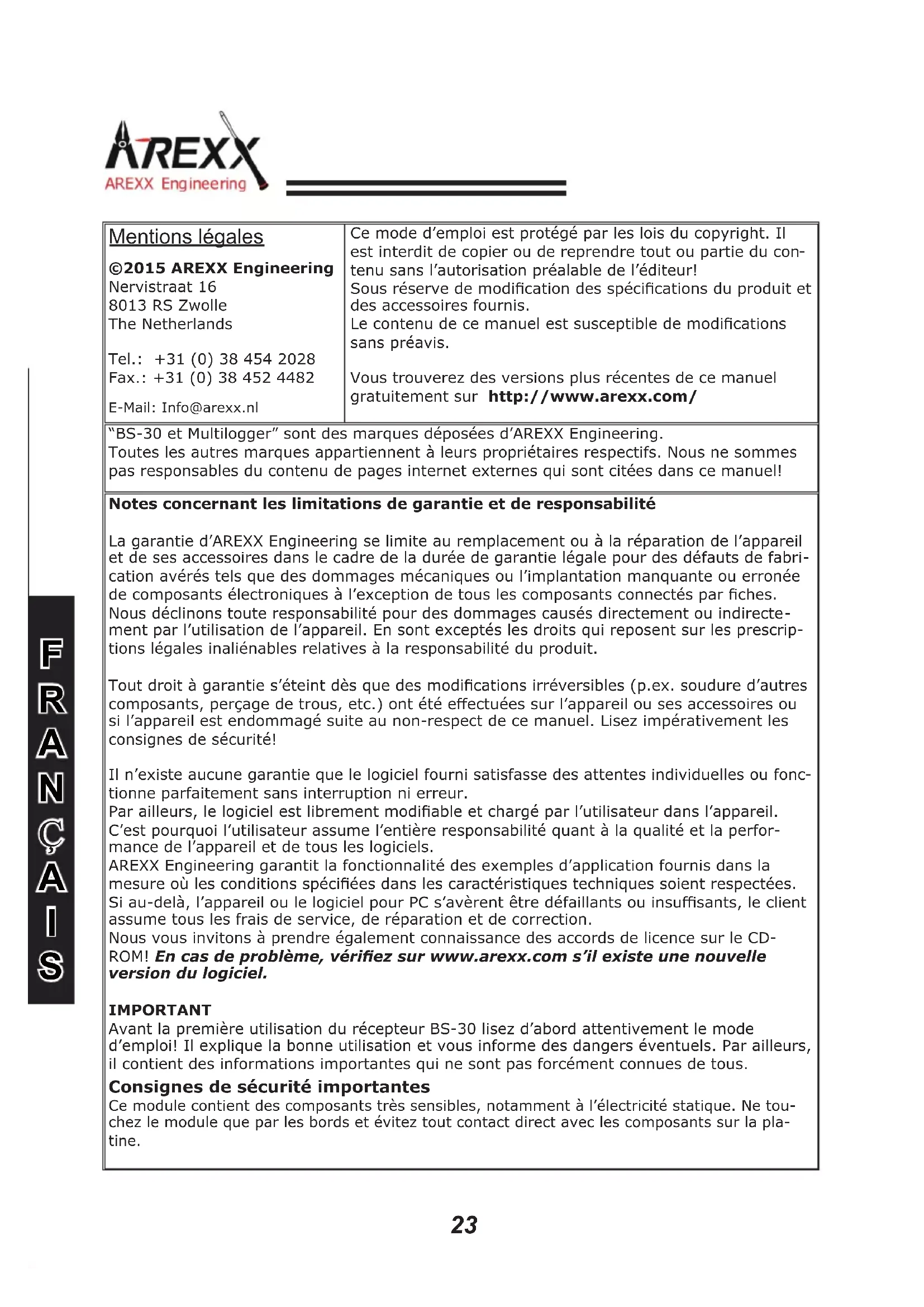 | Notes concernant les limitations de garantie et de responsabilitéLa garantie d'AREXX Engineering se limite au remplacement ou à la réparation de l'appareil et de ses accessoires dans le cadre de la durée de garantie légale pour des défauts de fabrication avérés tels que des dommages mécaniques ou l'implantation manquante ou erronée de composants électroniques à l'exception de tous les composants connectés par fiches.Nous déclinons toute responsabilité pour des dommages causés directement ou indirectement par l'utilisation de l'appareil. En sont exceptés les droits qui reposent sur les prescriptions légales inaliénables relatives à la responsabilité du produit.Tout droit à garantie s'éteint dès que des modifications irréversibles (p.ex. soudure d'autres composants, perçage de trous, etc.) ont été effectuées sur l'appareil ou ses accessoires ou si l'appareil est endommagé suite au non-respect de ce manuel. Lisez impérativement les consignes de sécurité!I n'existe aucune garantie que le logiciel fourni satisfasse des attentes individuelles ou fonctionne parfaitement sans interruption ni erreur.Par ailleurs, le logiciel est librement modifiable et chargé par l'utilisateur dans l'appareil.C'est pourquoi l'utilisateur assume l'entière responsabilité quant à la qualité et la performance de l'appareil et de tous les logiciels.AREXX Engineering garantit la fonctionnalité des exemples d'application fournis dans la mesure où les conditions spécifiées dans les caractéristiques techniques soient respectées.Si au-delà, l'appareil ou le logiciel pour PC s'avèrent être défaillants ou insuffisants, le client assume tous les frais de service, de réparation et de correction.Nous vous invitons à prendre également connaissance des accords de licence sur le CD-ROM!En cas de problème, vérifiez sur www.arexx.com s'il existe une nouvelle version du logiciel.IMPORTANTAvant la première utilisation du récepteur BS-30 lisez d'abord attentivement le mode d'emploi! Il explique la bonne utilisation et vous informe des dangers éventuels. Par ailleurs, il contient des informations importantes qui ne sont pas forcément connues de tous.Consignes de sécurité importantesCe module contient des composants très sensibles, notamment à l'électricité statique. Ne touchez le module que par les bords et évitez tout contact direct avec les composants sur la platine. | |