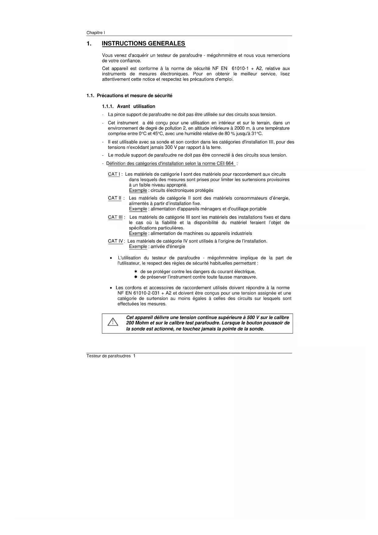 L'utilisation du testeur de parafoudre - mégohmembre implique de la part de l'utilisateur, le respect des règes de sécurité habituelles permettant :