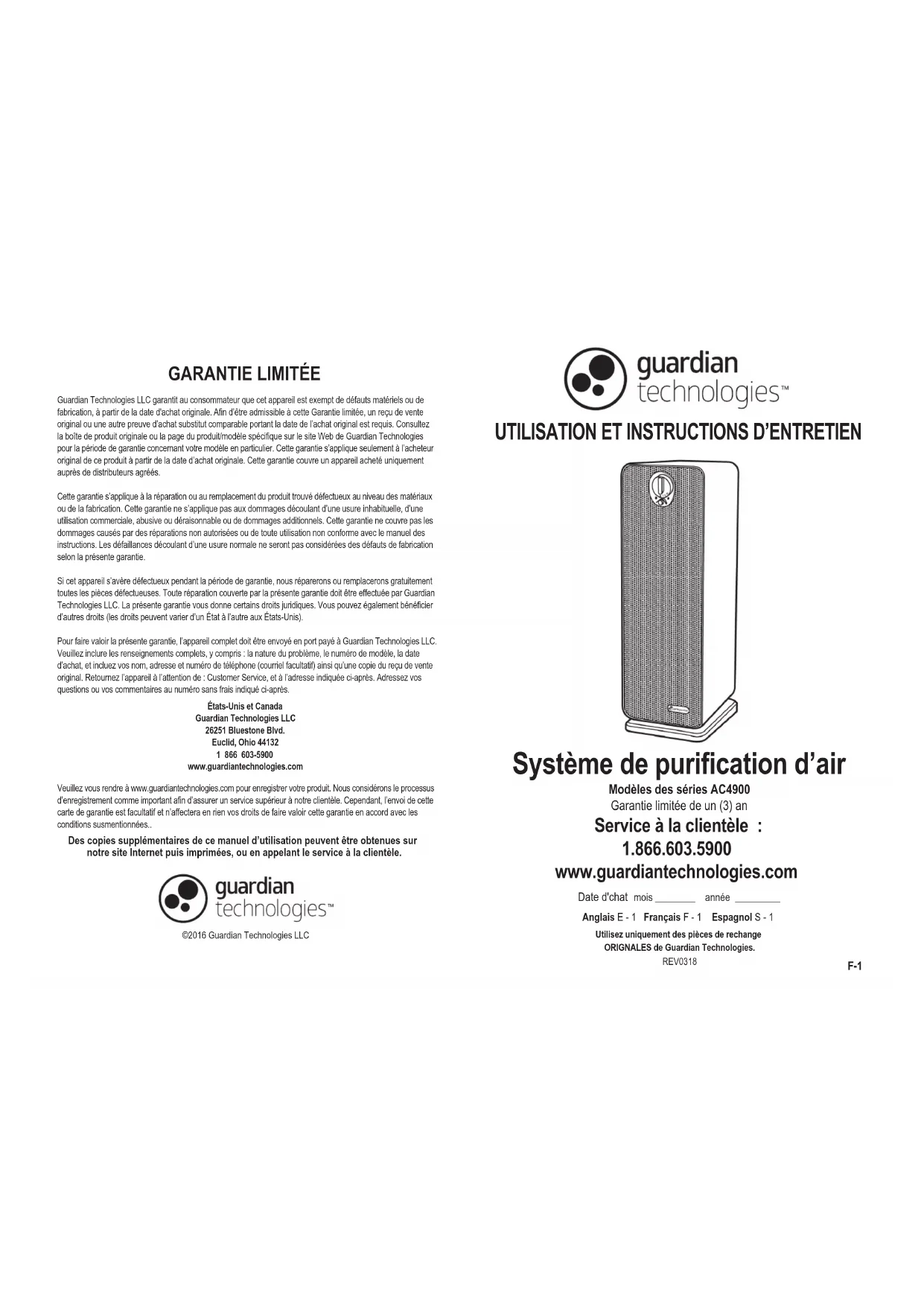 AC4900 - Purificateur d'air Guardian - Notice d'utilisation et mode d'emploi gratuit