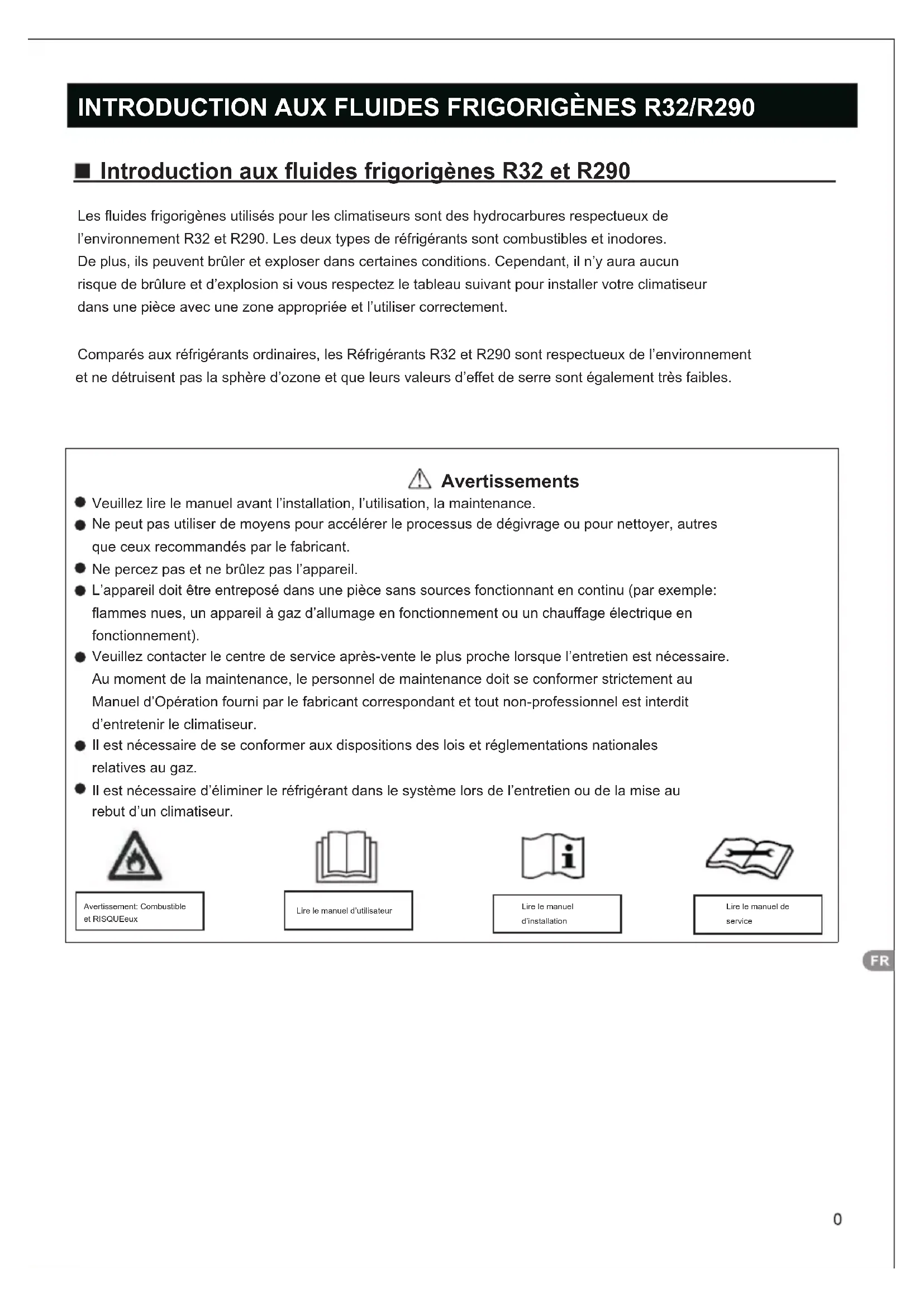 ˇˇˇˇˇˇˇINTRODUCTION AUX FLUIDES FRIGORIGÈNES R32/R290 Introduction aux fluides frigorigènes R32 et R290 Les fluides frigorigènes utilisés pour les climatiseurs sont des hydrocarbures respectueux de l’environnement R32 et R290. Les deux types de réfrigérants sont combustibles et inodores. De plus, ils peuvent brûler et exploser dans certaines conditions. Cependant, il n’y aura aucun risque de brûlure et d’explosion si vous respectez le tableau suivant pour installer votre climatiseur dans une pièce avec une zone appropriée et l’utiliser correctement. Comparés aux réfrigérants ordinaires, les Réfrigérants R32 et R290 sont respectueux de l’environnement et ne détruisent pas la sphère d’ozone et que leurs valeurs d’effet de serre sont également très faibles. Avertissements Veuillez lire le manuel avant l’installation, l’utilisation, la maintenance. Ne peut pas utiliser de moyens pour accélérer le processus de dégivrage ou pour nettoyer, autres que ceux recommandés par le fabricant. Ne percez pas et ne brûlez pas l’appareil. L’appareil doit être entreposé dans une pièce sans sources fonctionnant en continu (par exemple: flammes nues, un appareil à gaz d’allumage en fonctionnement ou un chauffage électrique en fonctionnement). Veuillez contacter le centre de service après-vente le plus proche lorsque l’entretien est nécessaire. Au moment de la maintenance, le personnel de maintenance doit se conformer strictement au Manuel d’Opération fourni par le fabricant correspondant et tout non-professionnel est interdit d’entretenir le climatiseur. Il est nécessaire de se conformer aux dispositions des lois et réglementations nationales relatives au gaz. Il est nécessaire d’éliminer le réfrigérant dans le système lors de l’entretien ou de la mise au rebut d’un climatiseur.