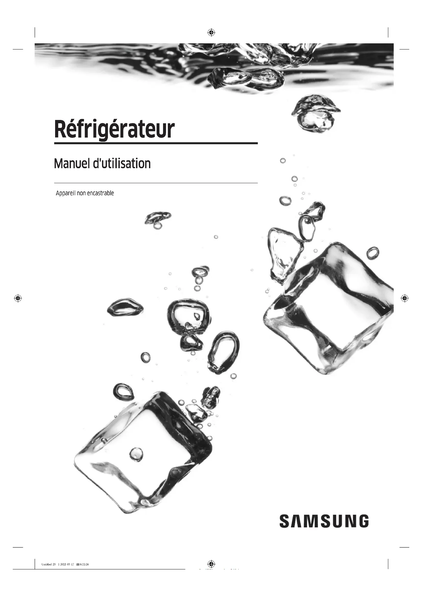 WhatsApp +962-79-777-7421 www.samsung.com/levant/support ALGERIA 3004 www.samsung.com/n_africa/supportTUNISIA 80 100 012 MOROCCO 080 100 22 55 DA68-04024L-03 Untitled-23 92 2022-05-17 6:16:58Réfrigérateur Manuel d'utilisation Appareil non encastrable Untitled-25 1 2022-05-17 6:22:26Français2 Sommaire Sommaire Consignes de sécurité 3 Ce que vous devez savoir concernant les consignes de sécurité 3 Consignes et symboles de sécurité importants : 5 Mesures importantes de sécurité 6 Symboles d'avertissement importants concernant le transport et le lieu d'installation de l'appareil 9 Avertissements importants concernant l'installation 10 Consignes d'installation 13 Avertissements importants concernant l'utilisation 13 Consignes d'utilisation 18 Consignes de nettoyage 20 Avertissements importants concernant la mise au rebut 22 Conseils complémentaires pour une utilisation appropriée 23 Instructions concernant la règlementation DEEE 24 Installation 25 Présentation rapide du réfrigérateur 26 Installation étape par étape 30 Opérations 50 Panneau de commande 50 SmartThings 54 Fonctions spéciales 57 Maintenance 71 Manipulation et entretien 71 Nettoyage 79 Remplacement 80 Dépannage 83 Généralités 83 Entendez-vous des sons anormaux provenant du réfrigérateur ? 87 SmartThings 89 Open Source Announcement 90 Untitled-25 2 2022-05-17 6:22:26Français 3 Consignes de sécurité Avant d'utiliser votre nouveau réfrigérateur Samsung, veuillez lire attentivement ce manuel an de vous assurer que vous savez comment utiliser de manière sûre et efcace ses différentes fonctions et fonctionnalités. Ce que vous devez savoir concernant les consignes de sécurité