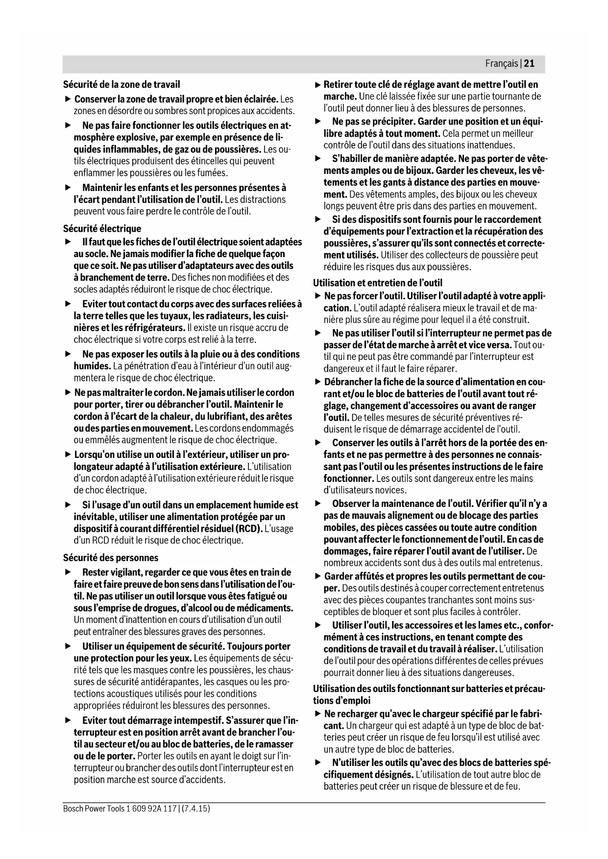 Retirer toute clé de réglage avant de mettre l’outil en marche. Une clé laissée fixée sur une partie tournante de l’outil peut donner lieu à des blessures de personnes. Ne pas se précipiter. Garder une position et un équi- libre adaptés à tout moment. Cela permet un meilleur contrôle de l’outil dans des situations inattendues. S’habiller de manière adaptée. Ne pas porter de vête- ments amples ou de bijoux. Garder les cheveux, les vê- tements et les gants à distance des parties en mouve- ment. Des vêtements amples, des bijoux ou les cheveux longs peuvent être pris dans des parties en mouvement. Si des dispositifs sont fournis pour le raccordement d’équipements pour l’extraction et la récupération des poussières, s’assurer qu’ils sont connectés et correcte- ment utilisés. Utiliser des collecteurs de poussière peut réduire les risques dus aux poussières. Utilisation et entretien de l’outil Ne pas forcer l’outil. Utiliser l’outil adapté à votre appli- cation. L’outil adapté réalisera mieux le travail et de ma- nière plus sûre au régime pour lequel il a été construit. Ne pas utiliser l’outil si l’interrupteur ne permet pas de passer de l’état de marche à arrêt et vice versa. Tout ou- til qui ne peut pas être commandé par l’interrupteur est dangereux et il faut le faire réparer. Débrancher la fiche de la source d’alimentation en cou- rant et/ou le bloc de batteries de l’outil avant tout ré- glage, changement d’accessoires ou avant de ranger l’outil. De telles mesures de sécurité préventives ré- duisent le risque de démarrage accidentel de l’outil. Conserver les outils à l’arrêt hors de la portée des en- fants et ne pas permettre à des personnes ne connais- sant pas l’outil ou les présentes instructions de le faire fonctionner. Les outils sont dangereux entre les mains d’utilisateurs novices. Observer la maintenance de l’outil. Vérifier qu’il n’y a pas de mauvais alignement ou de blocage des parties mobiles, des pièces cassées ou toute autre condition pouvant affecter le fonctionnement de l’outil. En cas de dommages, faire réparer l’outil avant de l’utiliser. De nombreux accidents sont dus à des outils mal entretenus. Garder affûtés et propres les outils permettant de cou- per. Des outils destinés à couper correctement entretenus avec des pièces coupantes tranchantes sont moins sus- ceptibles de bloquer et sont plus faciles à contrôler. Utiliser l’outil, les accessoires et les lames etc., confor- mément à ces instructions, en tenant compte des conditions de travail et du travail à réaliser. L’utilisation de l’outil pour des opérations différentes de celles prévues pourrait donner lieu à des situations dangereuses. Utilisation des outils fonctionnant sur batteries et précau- tions d’emploi Ne recharger qu’avec le chargeur spécifié par le fabri- cant. Un chargeur qui est adapté à un type de bloc de bat- teries peut créer un risque de feu lorsqu’il est utilisé avec un autre type de bloc de batteries. N’utiliser les outils qu’avec des blocs de batteries spé- cifiquement désignés. L’utilisation de tout autre bloc de batteries peut créer un risque de blessure et de feu. OBJ_BUCH-1808-002.book Page 21 Tuesday, April 7, 2015 4:33 PM22 | Français 1 609 92A 117 | (7.4.15) Bosch Power Tools Lorsqu’un bloc de batteries n’est pas utilisé, le mainte- nir à l’écart de tout autre objet métallique, par exemple trombones, pièces de monnaie, clés, clous, vis ou autres objets de petite taille qui peuvent donner lieu à une connexion d’une borne à une autre. Le court-circui- tage des bornes d’une batterie entre elles peut causer des brûlures ou un feu. Dans de mauvaises conditions, du liquide peut être éjecté de la batterie ; éviter tout contact. En cas de contact accidentel, nettoyer à l’eau. Si le liquide entre en contact avec les yeux, rechercher en plus une aide médicale. Le liquide éjecté des batteries peut causer des irritations ou des brûlures. Maintenance et entretien Faire entretenir l’outil par un réparateur qualifié utili- sant uniquement des pièces de rechange identiques. Cela assurera que la sécurité de l’outil est maintenue. Instructions de sécurité pour les découpeurs- ponceurs sans fil Tenir l’outil par les surfaces de préhension isolées, lors de la réalisation d’une opération au cours de laquelle l’organe de coupe peut entrer en contact avec un câ- blage non apparent. Le contact avec un fil « sous tension » peut également mettre « sous tension » les parties métal- liques exposées de l’outil électrique et provoquer un choc électrique sur l’opérateur. N’utiliser l’outil électroportatif que pour un travail à sec. La pénétration d’eau dans un outil électroportatif aug- mente le risque d’un choc électrique. Attention ! Risque d’incendie ! Eviter la surchauffe des matériaux travaillés et de la ponceuse. Vider toujours le bac de récupération des poussières avant de faire une pause de travail. Les particules de poussière se trouvant dans le sac à poussières, le microfiltre, le sac en papier (ou dans le sac à poussières en tissu ou le filtre de l’aspirateur) peuvent s’enflammer d’elles-mêmes dans des conditions défavorables, p. ex. projection d’étincelles lors du ponçage de pièces en métal, ceci notamment lorsque les particules de poussières sont mélangées à des résidus de vernis, de polyuréthane ou d’autres substances chimiques et que les matériaux travaillés sont très chauds après avoir été travail- lés pendant une période assez longue. Garder les mains à distance de la zone de sciage. Ne pas passer les mains sous la pièce à travailler. Lors d’un contact avec la lame de scie, il y a risque de blessures. Utiliser des détecteurs appropriés afin de déceler des conduites cachées ou consulter les entreprises d’ap- prov