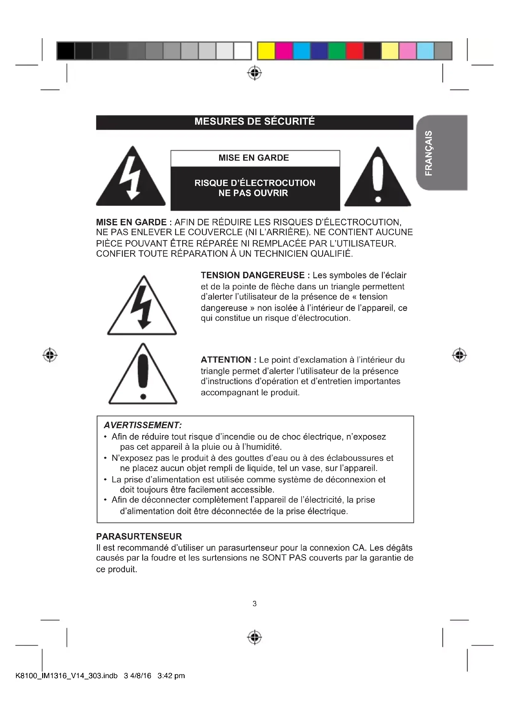 PARASURTENSEUR Il est recommandé d’utiliser un parasurtenseur pour la connexion CA. Les dégâts causés par la foudre et les surtensions ne SONT PAS couverts par la garantie de ce produit. K8100_IM1316_V14_303.indb 3 4/8/16 3:42 pmFRANÇAIS
