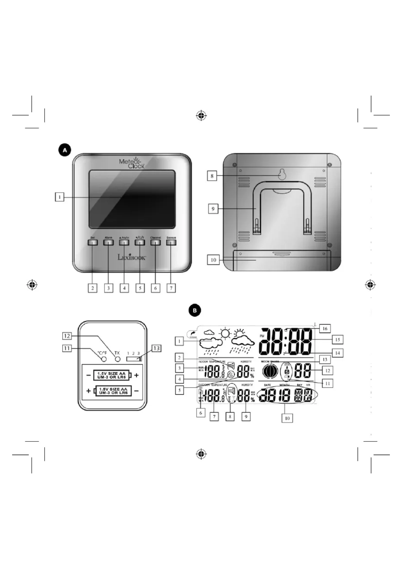 Silver SM940_02 Mode d’emploi – Instruction manualCopyright © Lexibook 2010 Félicitations pour votre acquisition de cette station météo, MeteoClock® Silver SM940_02. Prenez le temps de lire et de comprendre ce manuel, ainsi vous pourrez commencer à proter de tous les avantages et fonctions que ce produit vous offre. Qu’est-ce qu’une station météo ? Les stations digitales Lexibook mesurent non seulement le temps qui passe grâce à leur horloge intégrée, mais aussi le temps qu’il fait et qu’il fera à court terme ! La MeteoClock® Silver SM940_02 intègre les fonctions principales suivantes : - Thermomètre : La température est afchée au dixième de Centigrade près et en temps réel. Grâce à son capteur sans l la station peut connaître à distance la température à l’extérieur ou dans une autre pièce ! - Hygromètre : L’hygrométrie extérieure ou intérieure est exprimée en pourcentage d’humidité dans l’air. La “Zone de Confort” idéale pour le corps humain se situe entre 35% et 65% d’hygrométrie pour une température de 18°C à 24°C. - Baromètre : La station mesure la pression atmosphérique et, d’après l’évolution de celle-ci, afche une prévision barométrique sous forme d’icônes animés (soleil, nuages, pluie) pour les prochaines 12 à 24 heures. Voir image A Unité principale