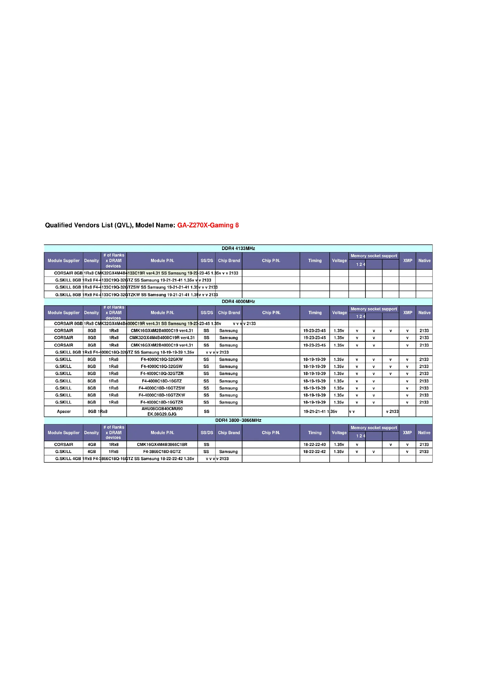 La GIGABYTE GAZ270XGaming 8 est compatible avec la mémoire DDR4. Elle prend en charge jusqu'à 64 Go de RAM à des vitesses allant jusqu'à 4000 MHz (OC).
