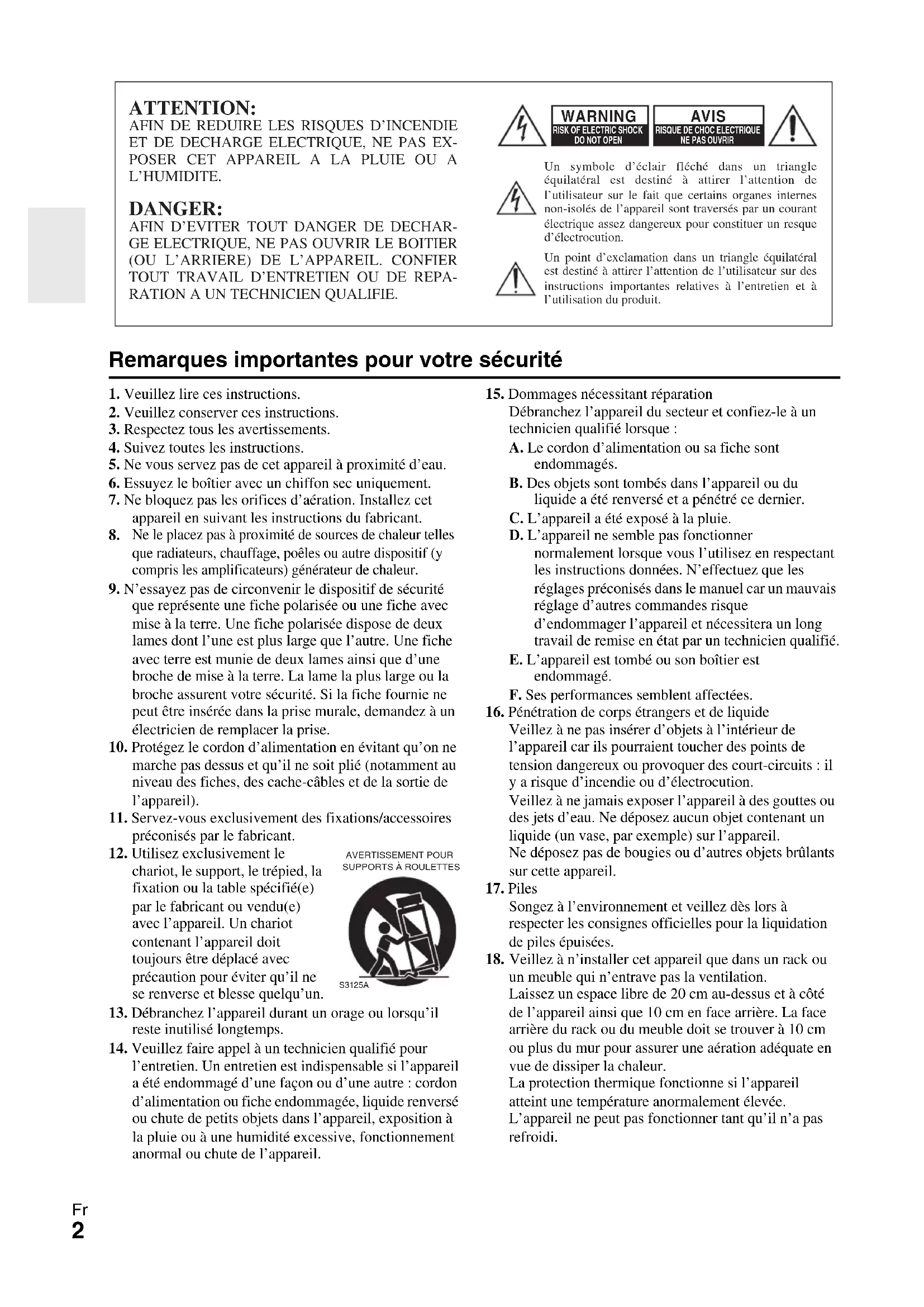 AFIN D’EVITER TOUT DANGER DE DECHAR-GE ELECTRIQUE, NE PAS OUVRIR LE BOITIER (OU L’ARRIERE) DE L’APPAREIL. CONFIER TOUT TRAVAIL D’ENTRETIEN OU DE REPA-RATION A UN TECHNICIEN QUALIFIE.Un symbole d’éclair fléché dans un triangle équilatéral est destiné à attirer l’attention de l’utilisateur sur le fait que certains organes internes non-isolés de l’appareil sont traversés par un courant électrique assez dangereux pour constituer un resque d’électrocution.Un point d’exclamation dans un triangle équilatéral est destiné à attirer l’attention de l’utilisateur sur des instructions importantes relatives à l’entretien et à l’utilisation du produit. WARNING RISK OF ELECTRIC SHOCKDO NOT OPENRISQUE DE CHOC ELECTRIQUENE PAS OUVRIR AVIS AVERTISSEMENT POUR SUPPORTS À ROULETTES S3125A3