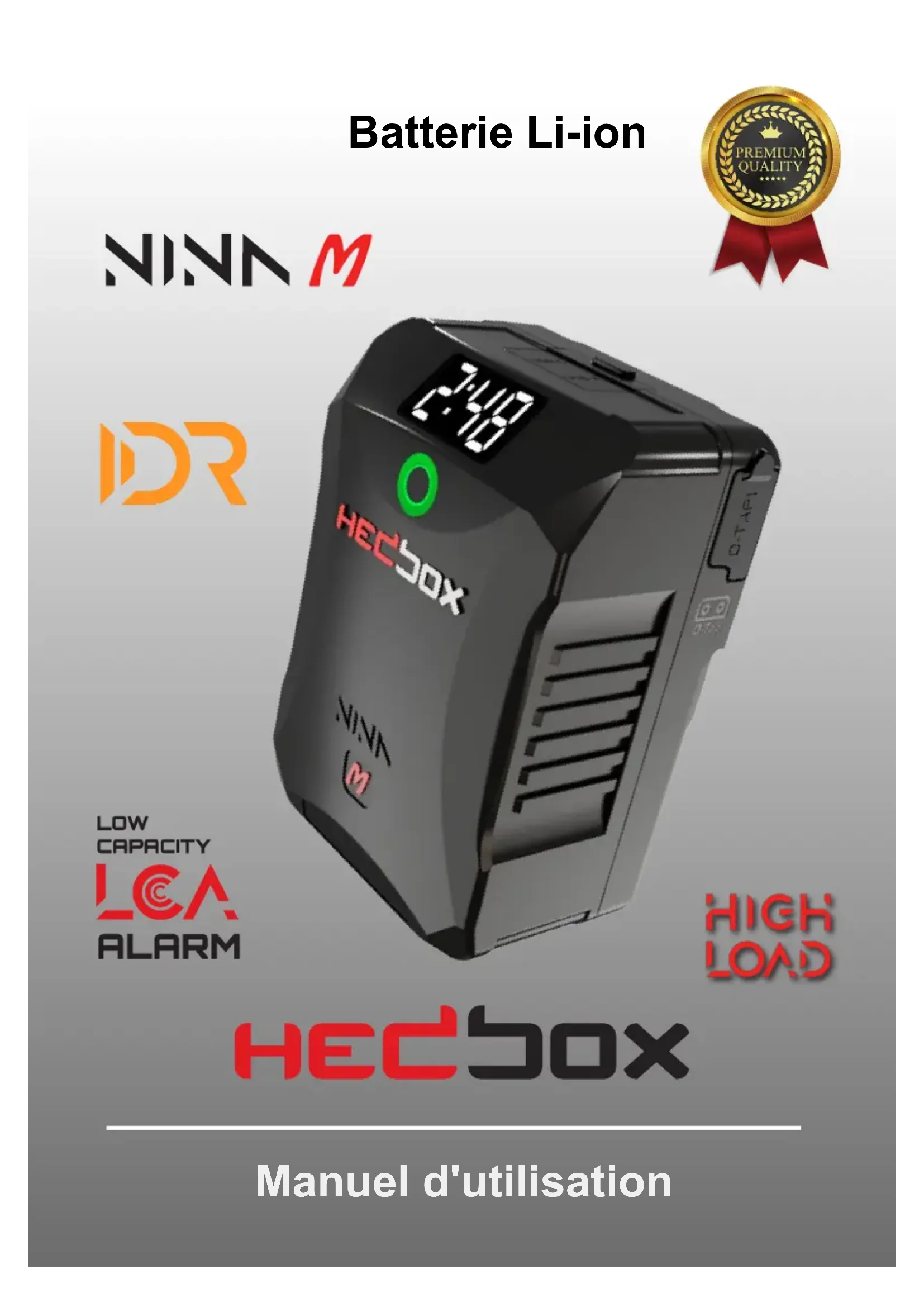 Specification Model: Mount Type:Info Display: Nominal Voltage:Maximum Charging:Maximum Load:Battery Capacity: USB-A Output Only :D-Tap 1/2 In / Output:Operating Temperature:Dimensions (W/H/D) Net Weight:Aucun remboursement pour le contenu enregistré.• Une indemnisation pour le contenu enregistré n'est pas envisageable en cas de dysfonctionnement de la batterie d'autres appareils, empêchant la prise de vue ou la reproduction.• Veuillez noter que la conception et les spécifications peuvent changer sans préavis. Si vous souhaitez en savoir plus sur les produits HEDBOX, veuillez visiter notre site Web : www.hedbox.com USB-C In / Output:IATA Transportation:Internal Protection:Recomend Charging On:Battery usage Circle:# 10