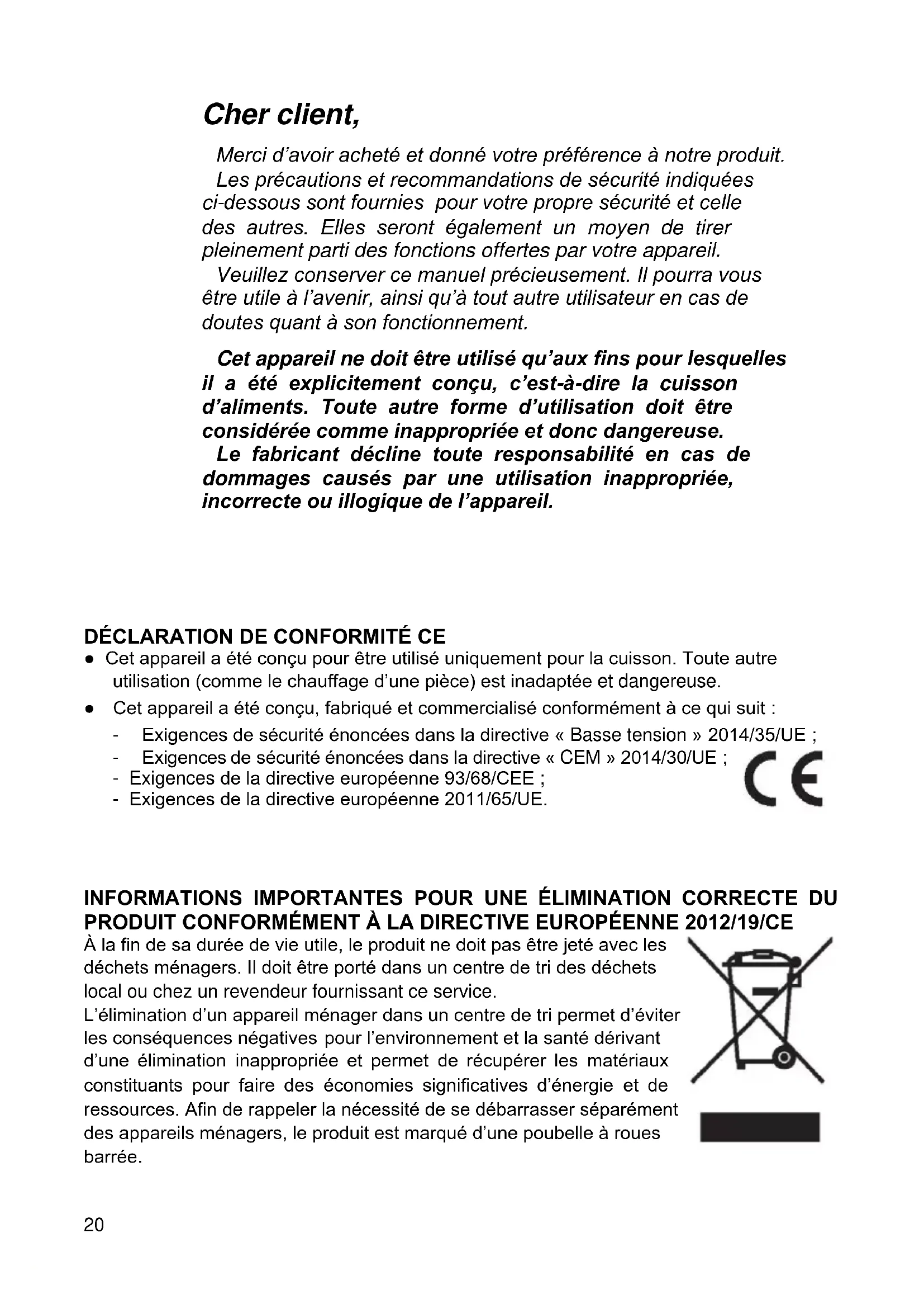 Cher client, Merci d’avoir acheté et donné votre préférence à notre produit. Les précautions et recommandations de sécurité indiquées ci-dessous sont fournies pour votre propre sécurité et celle des autres. Elles seront également un moyen de tirer pleinement parti des fonctions offertes par votre appareil. Veuillez conserver ce manuel précieusement. Il pourra vous être utile à l’avenir, ainsi qu’à tout autre utilisateur en cas de doutes quant à son fonctionnement. Cet appareil ne doit être utilisé qu’aux fins pour lesquelles il a été explicitement conçu, c’est-à-dire la cuisson d’aliments. Toute autre forme d’utilisation doit être considérée comme inappropriée et donc dangereuse. Le fabricant décline toute responsabilité en cas de dommages causés par une utilisation inappropriée, incorrecte ou illogique de l’appareil.