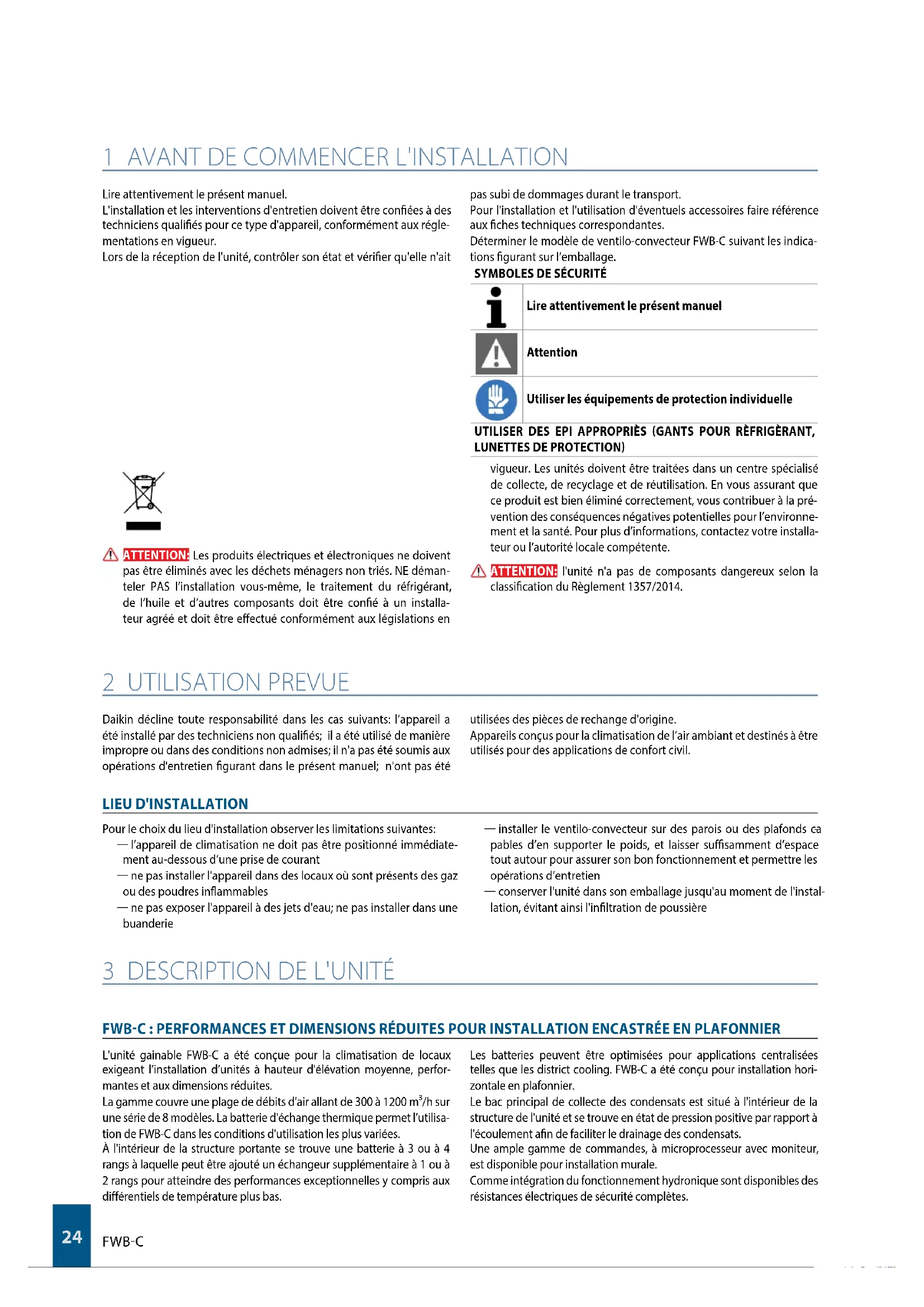 teler PAS l’installation vous-même, le traitement du réfrigérant, de l’huile et d’autres composants doit être coné à un installa- teur agréé et doit être eectué conformément aux législations en vigueur. Les unités doivent être traitées dans un centre spécialisé de collecte, de recyclage et de réutilisation. En vous assurant que ce produit est bien éliminé correctement, vous contribuer à la pré- vention des conséquences négatives potentielles pour l’environne- ment et la santé. Pour plus d’informations, contactez votre installa- teur ou l’autorité locale compétente. ATTENTION: l'unité n'a pas de composants dangereux selon la classication du Règlement 1357/2014. 2 UTILISATION PREVUE Daikin décline toute responsabilité dans les cas suivants: l’appareil a été installé par des techniciens non qualiés; il a été utilisé de manière impropre ou dans des conditions non admises; il n'a pas été soumis aux opérations d'entretien gurant dans le présent manuel; n'ont pas été utilisées des pièces de rechange d'origine. Appareils conçus pour la climatisation de l’air ambiant et destinés à être utilisés pour des applications de confort civil. LIEU D'INSTALLATION Pour le choix du lieu d'installation observer les limitations suivantes: l’appareil de climatisation ne doit pas être positionné immédiate- ment au-dessous d’une prise de courant ne pas installer l'appareil dans des locaux où sont présents des gaz ou des poudres inammables ne pas exposer l'appareil à des jets d'eau; ne pas installer dans une buanderie installer le ventilo-convecteur sur des parois ou des plafonds ca