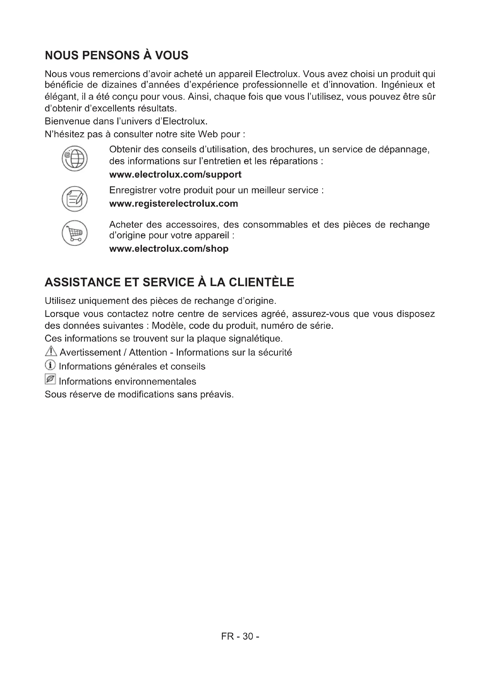 Nous vous remercions d’avoir acheté un appareil Electrolux. Vous avez choisi un produit qui bénéficie de dizaines d’années d’expérience professionnelle et d’innovation. Ingénieux et élégant, il a été conçu pour vous. Ainsi, chaque fois que vous l’utilisez, vous pouvez être sûr d’obtenir d’excellents résultats. Bienvenue dans l’univers d’Electrolux. N’hésitez pas à consulter notre site Web pour : Obtenir des conseils d’utilisation, des brochures, un service de dépannage, des informations sur l’entretien et les réparations : www.electrolux.com/support Enregistrer votre produit pour un meilleur service : www.registerelectrolux.com Acheter des accessoires, des consommables et des pièces de rechange d’origine pour votre appareil : www.electrolux.com/shop