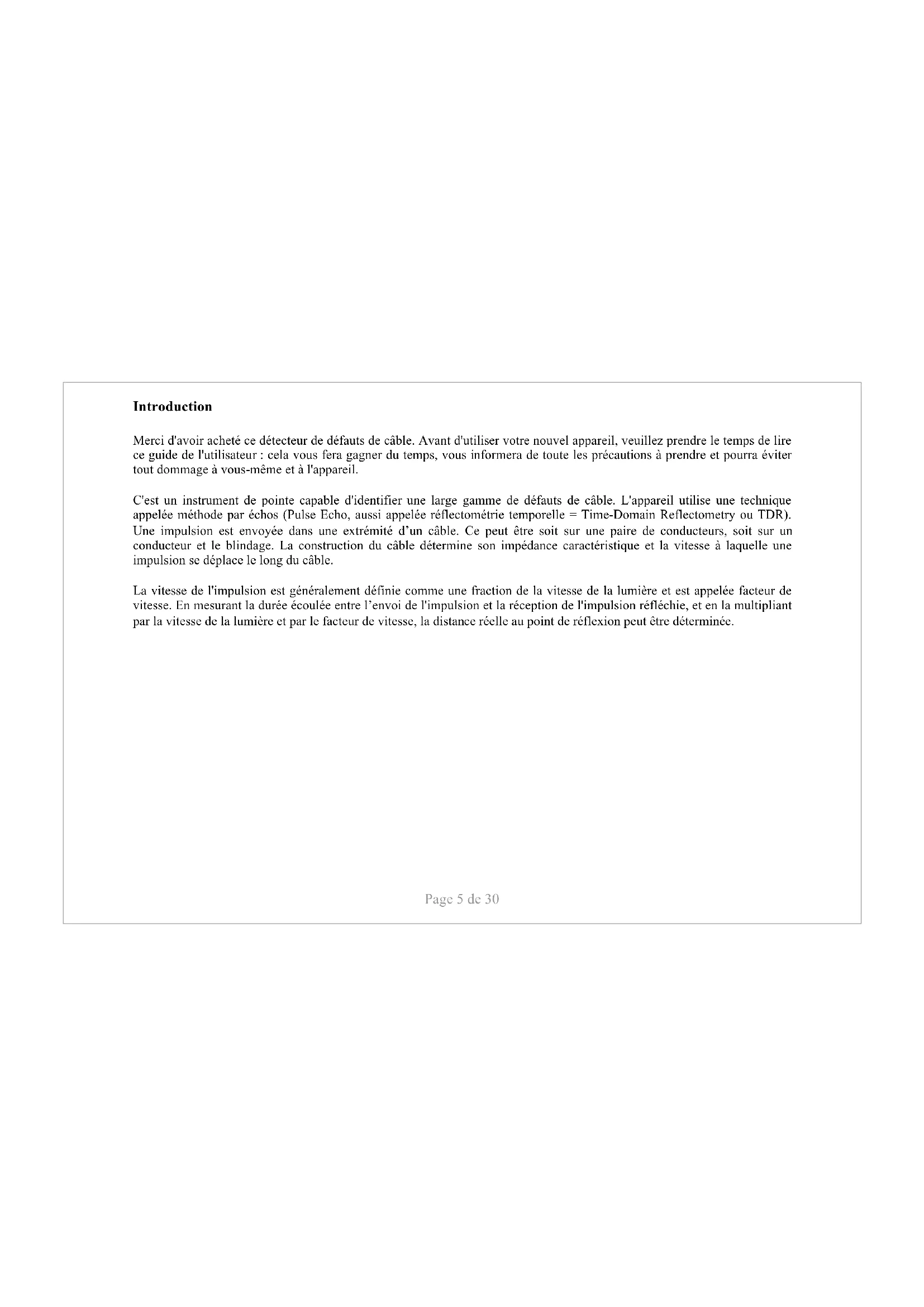 Merci d'avoir acheté ce détector de defaults de cable. Avant d'utiliser votre nouvel apparéil, veuilles prendre le temps de dire ce guide de l'utilisateur: cela vous fera gagner du temps, vous informera de toute les précautions à prendre et pourra éviter tout dommage à vous-même et à l' apparéil.