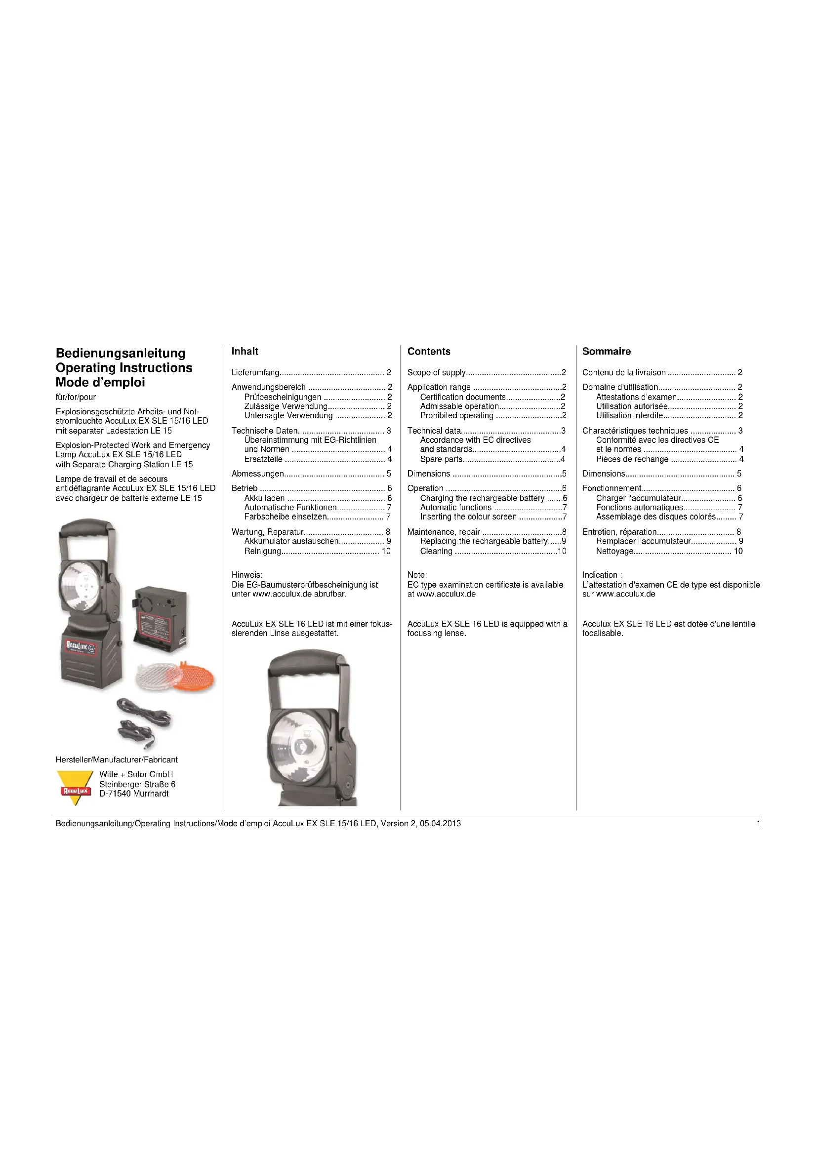 Carry out maintenance and repair work only outside the explosion protected areas! Be sure to adhere strictly to these operating instruc- tions! Entretien, réparation Avertissement Un entretien ou une réparation incorrecte peut entraî- ner la perte de la protection antidéflagrante. La lampe doit être contrôlée, entretenue et réparée uni- quement par du personnel qualifié. Ce personnel doit acquérir les connaissances spécifiques concernant les différents types de protection contre les explosions et modes d'installation, les lois et les directives correspon- dantes ainsi que les principes généraux des classements de zones EN 60079-19. Effectuez les travaux d'entretien et de réparation unique- ment en dehors des zones explosives. Suivez exactement les consignes données dans ce mode d'emploi.Bedienungsanleitung/Operating Instructions/Mode d’emploi AccuLux EX SLE 15/16 LED, Version 2, 05.04.2013 9