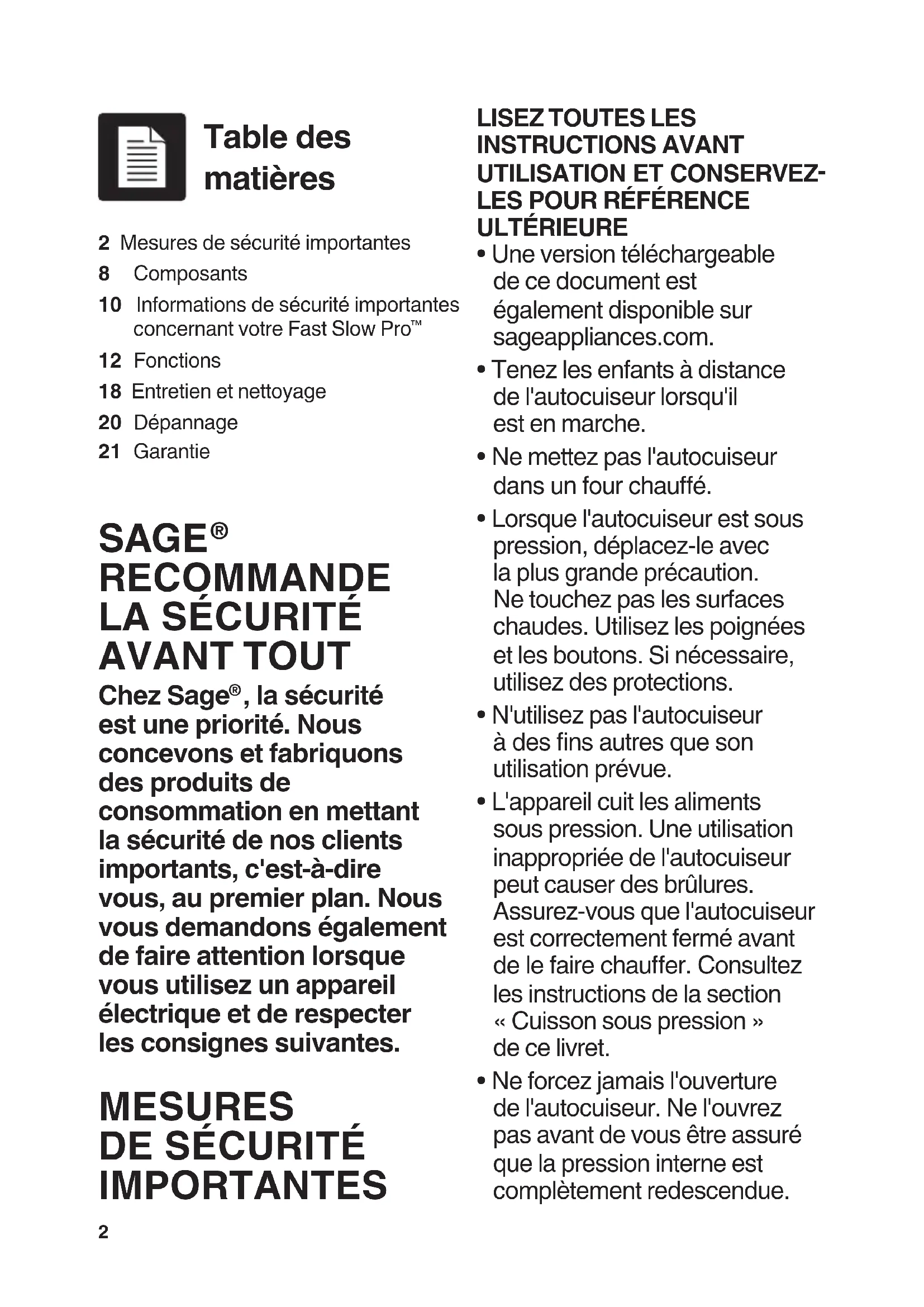 - Ne forcez jamais l'ouverture de l'autocuiseur. Ne l'ouvrez pas avant de vous être assuré que la pression interne est complètement redescendue. 2 Mesures de sécurité importantes8 Composants10 Informations de sécurité importantes concernant votre Fast Slow Pro 12 Fonctions18 Entretien et nettoyage20 Dépannage21 Garantie Table des matières SAGE