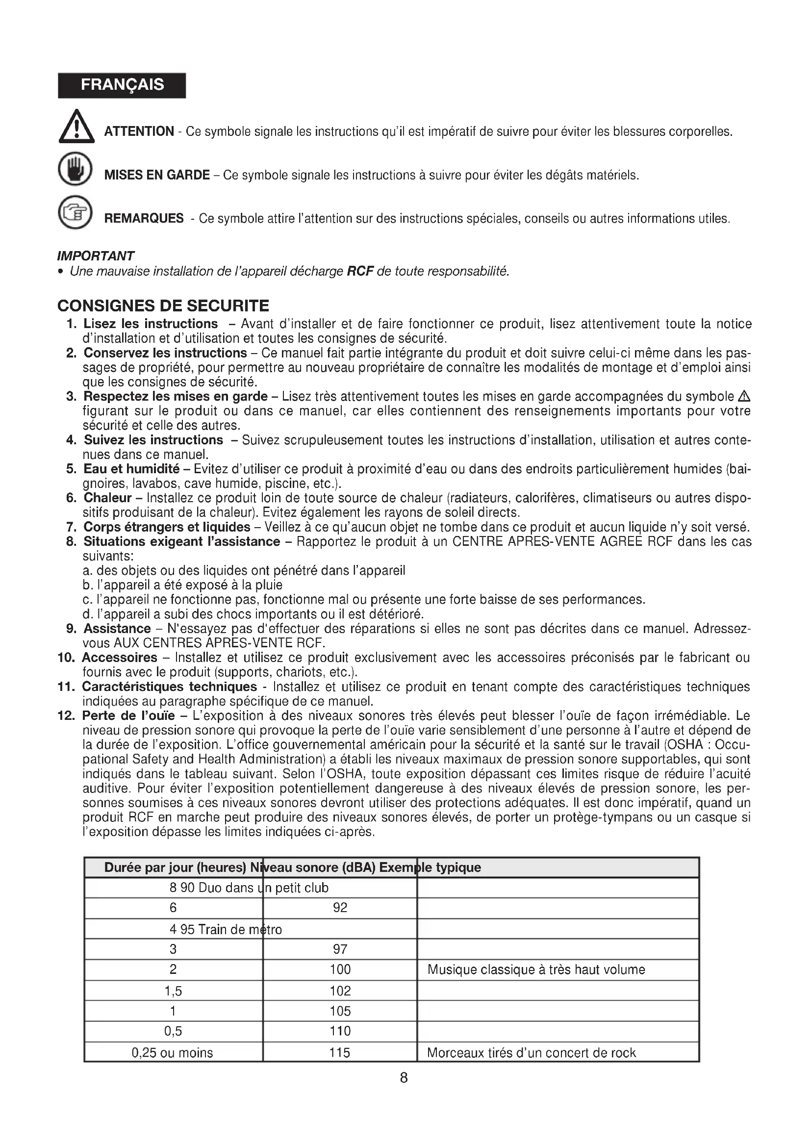 - Une mauvaise installation de l'appareil décharge RCF de toute responsabilité.