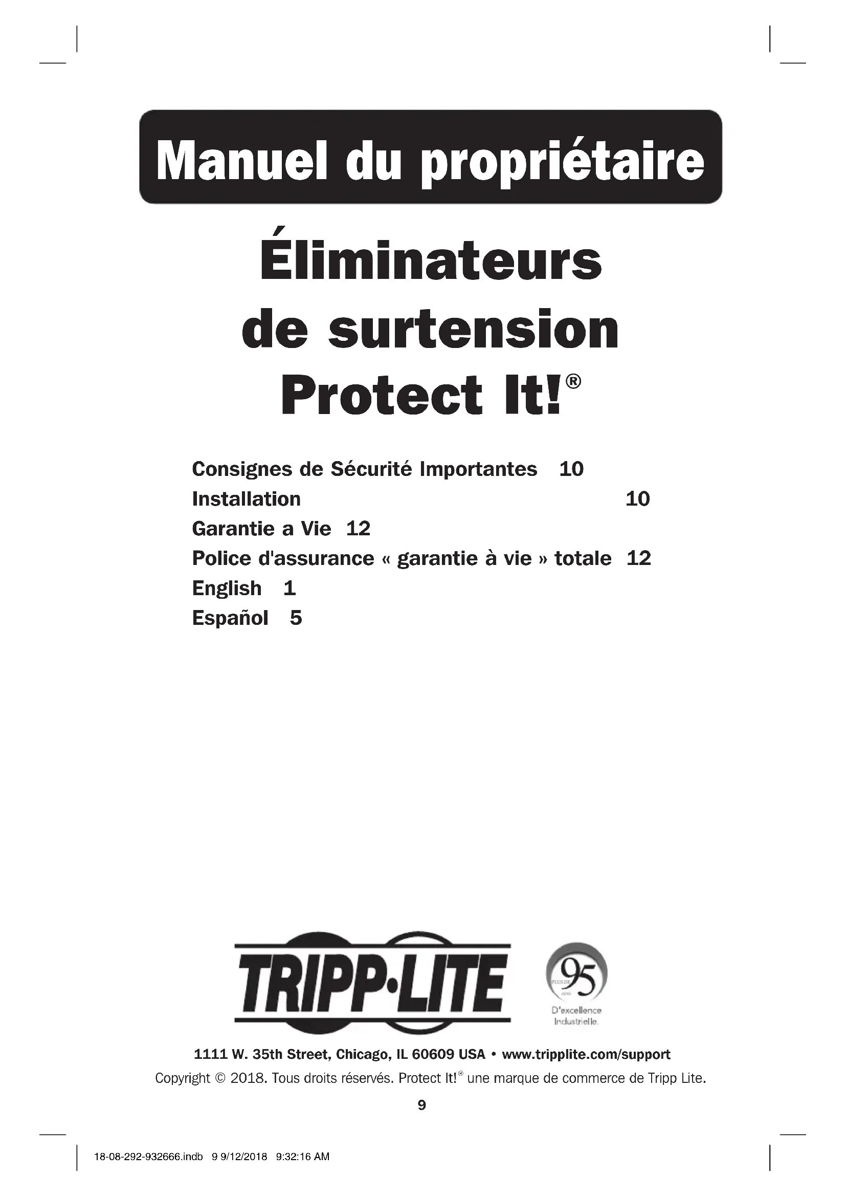 Consignes de Sécurité Importantes 10 Installation 10 Garantie a Vie 12 Police d'assurance « garantie à vie » totale 12 English 1 Español 5 1111 W. 35th Street, Chicago, IL 60609 USA • www.tripplite.com/support Copyright © 2018. Tous droits réservés. Protect It!
