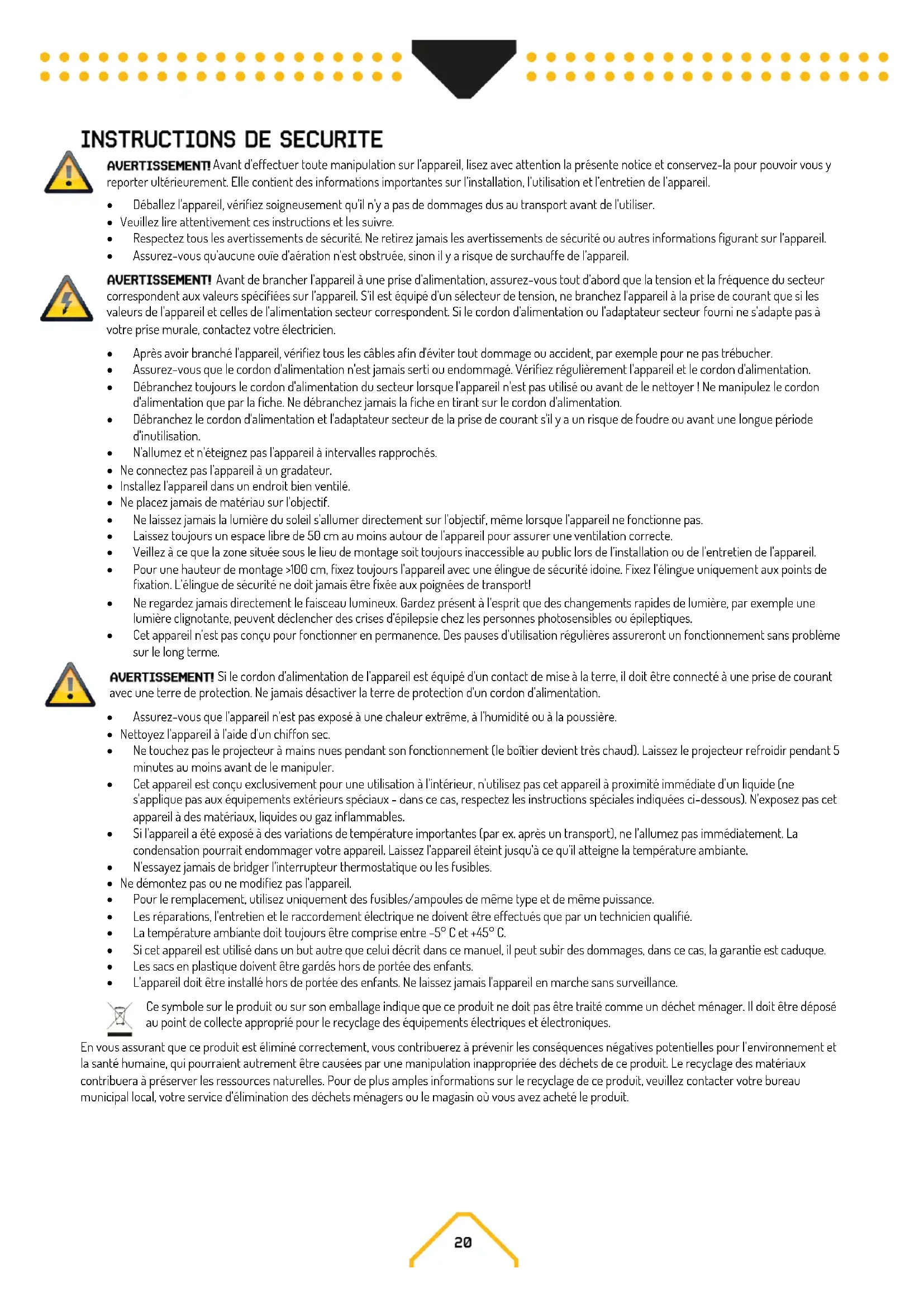 - Séchez le projecteur, les connecteurs et les contacts avec un chiffon doux, propre, non pelucheux ou de l'air comprimé basse pression avant de remettre le projecteur sous tension. La liste ci-dessous peut vous aider en cas de problèmes lors de l’utilisation du produit. Pas de réponse de l’appareil. L’appareil n’est pas alimenté. Vérifiez que l’appareil est sous tension. Vérifiez les câbles et branchements. Le fusible a fondu ou problème interne. Remplacer le fusible moyen ou contacter le support Beamz ou un partenaire de service agréé Beamz. N'enlevez pas les couvercles de la base. N'essayez pas de remplacer un fusible ou d'effectuer des réparations ou un entretien qui ne sont pas décrits dans ce manuel d'utilisation à moins d'avoir l'autorisation du support Beamz ou du service autorisé Beamz. L'appareil se réinitialise correctement mais ne répond pas (ou ne répond pas correctement) au contrôleur. Le contrôleur DMX n’est pas relié. Reliez le contrôleur. Mauvaise ligne DMX. Vérifiez les branchements et les câbles. Réparez ou remplacez les câbles défectueux. La ligne DMX n’a pas de résistance terminale. Insérez un bouchon DMX dans la prise de sortie DMX sur le dernier appareil de la ligne DMX. Mauvais adressage de l’appareil. Vérifiez l’adresse de l’appareil et les réglages DMX. Un appareil est défectueux et perturbe la transmission des données dans la ligne DMX. Débranchez les connecteurs DMX IN et OUT et relies-les directement ensemble pour bridger un appareil à la fois jusqu’à ce que le fonctionnement soit rétabli. Faites appel à un technicien qualifié pour réparer l’appareil. Les pins 2 et 3 sont inversés dans la connexion XLR. Vérifiez les câbles et branchements. Installez un câble inversion de phase entre les appareils ou remplacez les broches 2 et 3 dans l’appareil qui se comporte de manière erratique. Erreur après réinitialisation. L’effet nécessite un réglage mécanique. Vérifiez la version du logiciel de l'appareil et les messages d'erreur pour plus d'informations. Contacter le service après-vente Beamz ou un partenaire de service agréé Beamz. Le flux lumineux coupe de manière intermittente. L’appareil est trop chaud. Laisser refroidir l'appareil. Réduire la température ambiante. Veillez à ce que l'air circule librement autour de l'appareil. Nettoyer l'appareil si nécessaire. Les LEDs sont endommagées. Débrancher l'appareil et contacter le service après-vente Beamz ou un partenaire agréé Beamz.. Les réglages de l’alimentation ne correspondent pas à la tension AC et à la fréquence locales. Débranchez l’appareil. Vérifiez les réglages et corrigez si besoin.Przed przystąpieniem do jakichkolwiek czynności związanych z urządzeniem, należy uważnie przeczytać niniejszą instrukcję i zachować ją z lekarstwem na przyszłość. Zawiera ważne informacje dotyczące instalacji, użytkowania i konserwacji urządzenia.