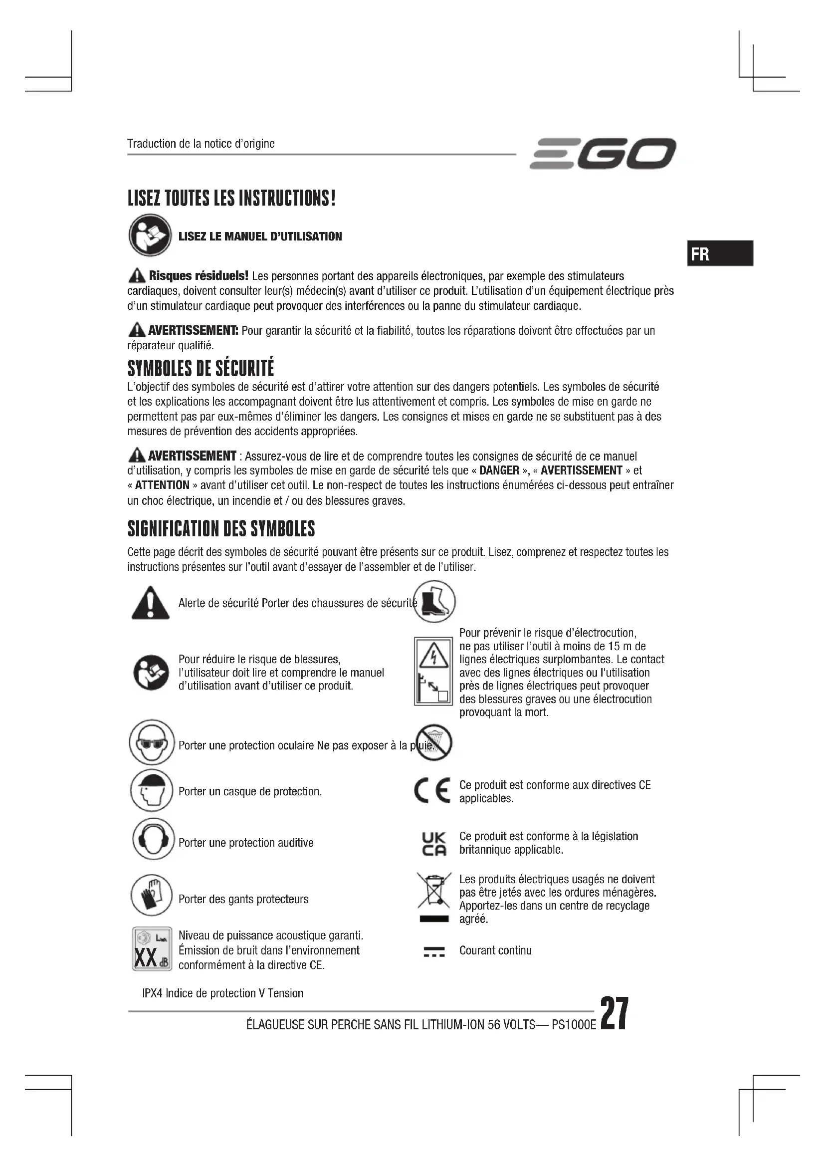PS1003E - Scie EGO - Notice d'utilisation et mode d'emploi gratuit