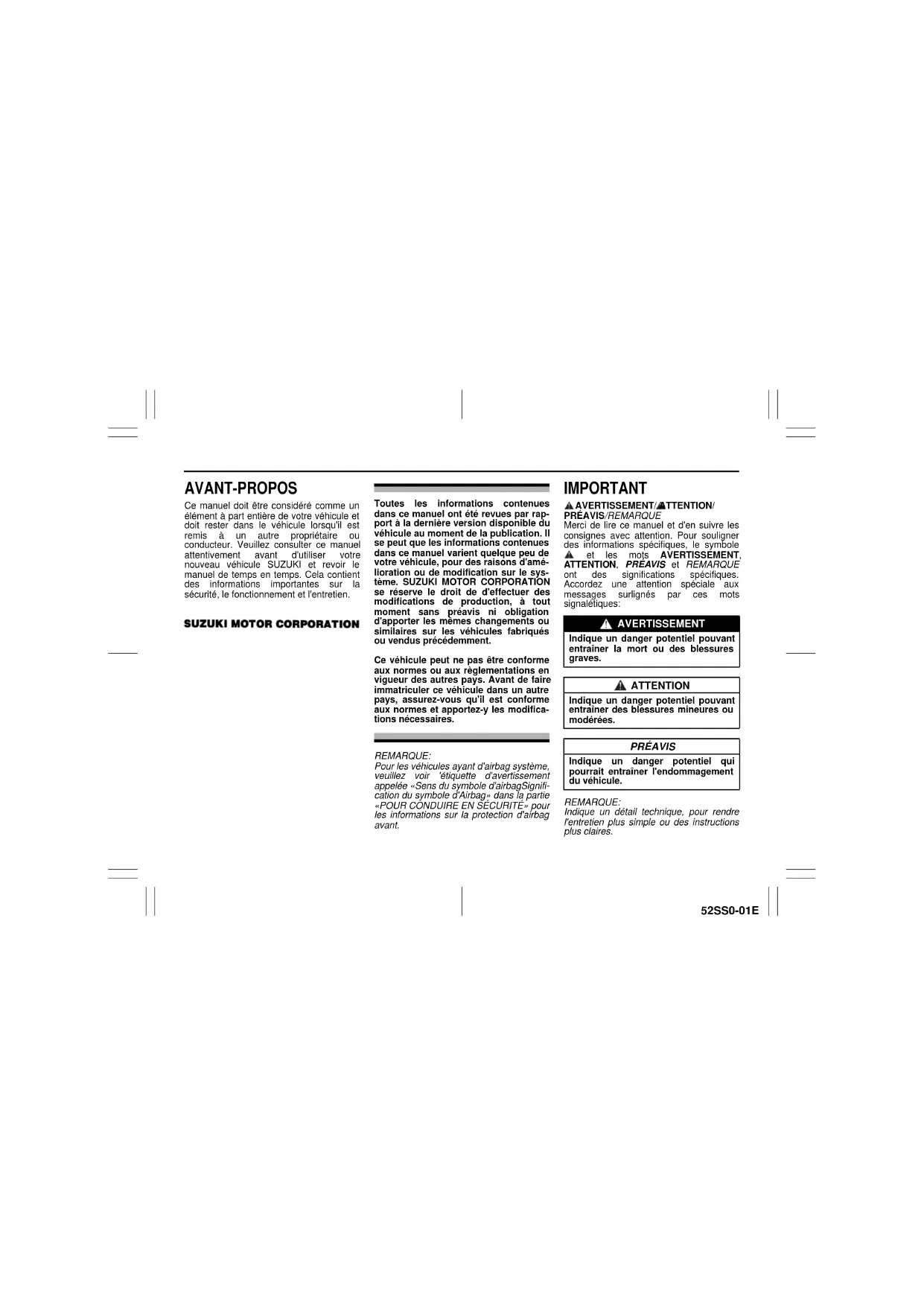 52SS0-01E AVANT-PROPOS Ce manuel doit être considéré comme un élément à part entière de votre véhicule et doit rester dans le véhicule lorsqu'il est remis à un autre propriétaire ou conducteur. Veuillez consulter ce manuel attentivement avant d'utiliser votre nouveau véhicule SUZUKI et revoir le manuel de temps en temps. Cela contient des informations importantes sur la sécurité, le fonctionnement et l'entretien. Toutes les informations contenues dans ce manuel ont été revues par rap- port à la dernière version disponible du véhicule au moment de la publication. Il se peut que les informations contenues dans ce manuel varient quelque peu de votre véhicule, pour des raisons d'amé- lioration ou de modification sur le sys- tème. SUZUKI MOTOR CORPORATION se réserve le droit de d'effectuer des modifications de production, à tout moment sans préavis ni obligation d'apporter les mêmes changements ou similaires sur les véhicules fabriqués ou vendus précédemment. Ce véhicule peut ne pas être conforme aux normes ou aux règlementations en vigueur des autres pays. Avant de faire immatriculer ce véhicule dans un autre pays, assurez-vous qu'il est conforme aux normes et apportez-y les modifica- tions nécessaires. REMARQUE: Pour les véhicules ayant d'airbag système, veuillez voir 'étiquette d'avertissement appelée «Sens du symbole d'airbagSignifi- cation du symbole d'Airbag» dans la partie «POUR CONDUIRE EN SÉCURITÉ» pour les informations sur la protection d'airbag avant. IMPORTANT AVERTISSEMENT/ ATTENTION/