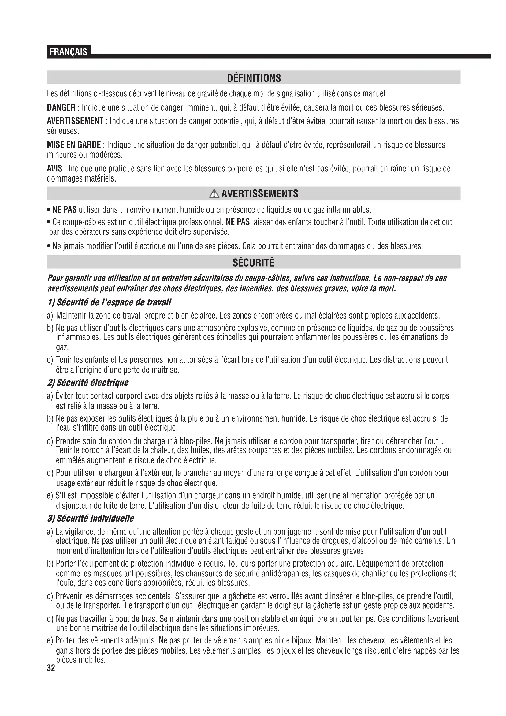 - Ne jamais modifier l’outil électrique ou l’une de ses pièces. Cela pourrait entraîner des dommages ou des blessures. SÉCURITÉ Pour garantir une utilisation et un entretien sécuritaires du coupe-câbles, suivre ces instructions. Le non-respect de ces avertissements peut entraîner des chocs électriques, des incendies, des blessures graves, voire la mort.