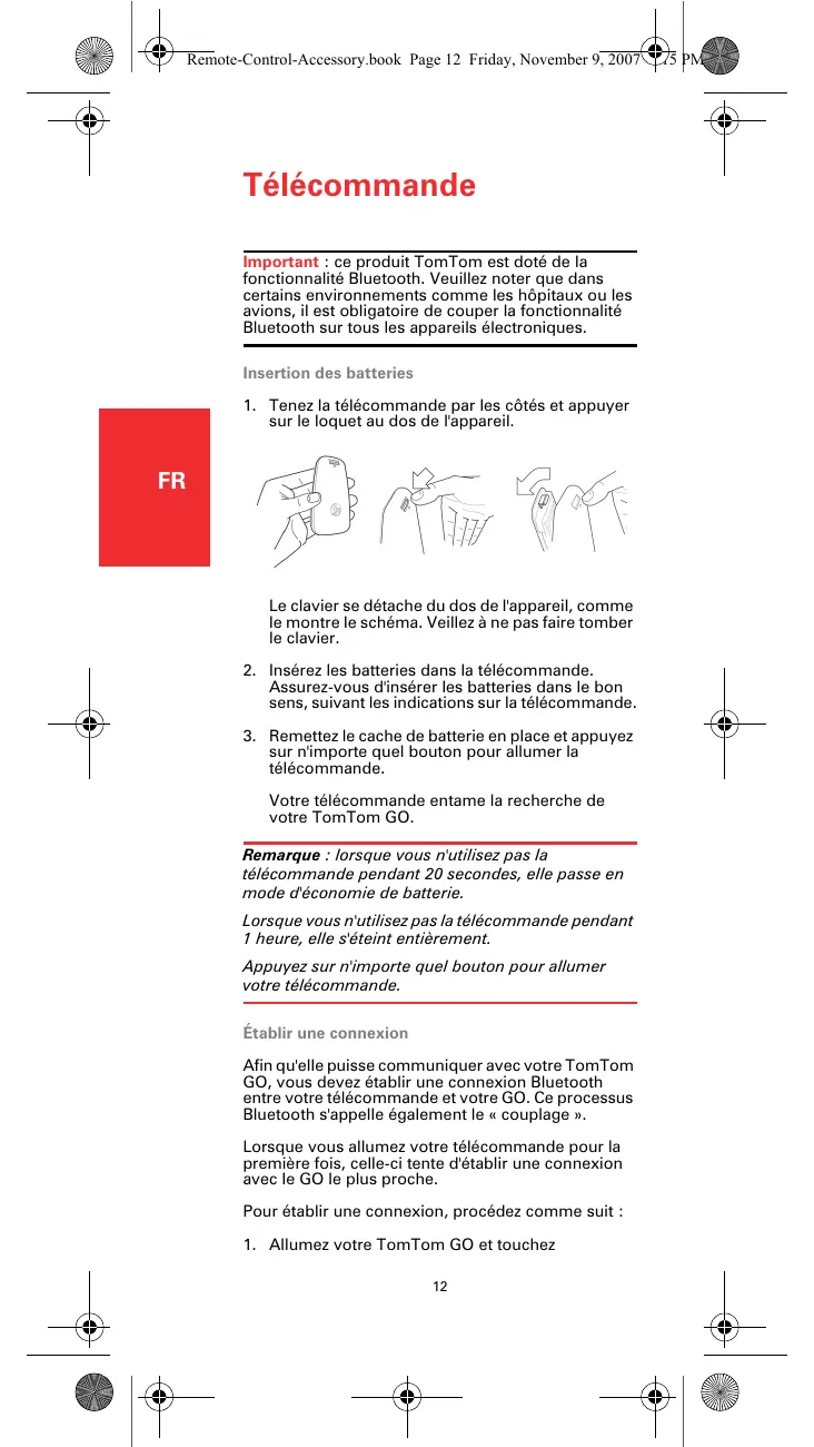 sur n'importe quel bouton pour allumer la télécommande. Votre télécommande entame la recherche de votre TomTom GO. Remarque : lorsque vous n'utilisez pas la télécommande pendant 20 secondes, elle passe en mode d'économie de batterie. Lorsque vous n'utilisez pas la télécommande pendant 1 heure, elle s'éteint entièrement. Appuyez sur n'importe quel bouton pour allumer votre télécommande. Établir une connexion Afin qu'elle puisse communiquer avec votre TomTom GO, vous devez établir une connexion Bluetooth entre votre télécommande et votre GO. Ce processus Bluetooth s'appelle également le « couplage ». Lorsque vous allumez votre télécommande pour la première fois, celle-ci tente d'établir une connexion avec le GO le plus proche. Pour établir une connexion, procédez comme suit :